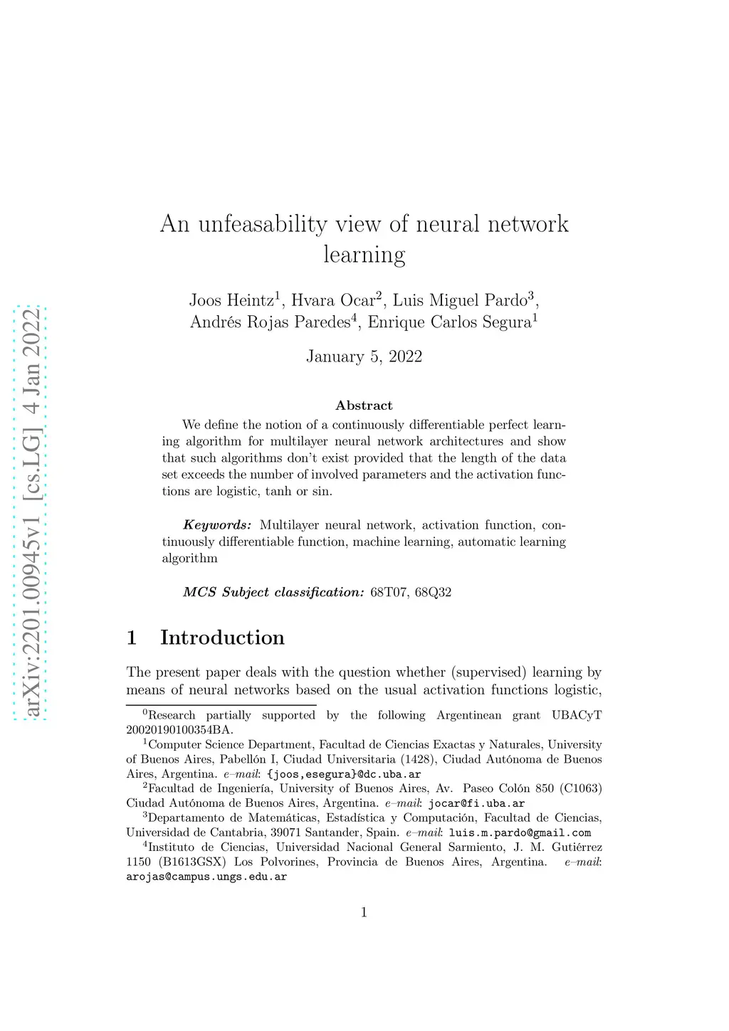 An unfeasability view of neural network learning