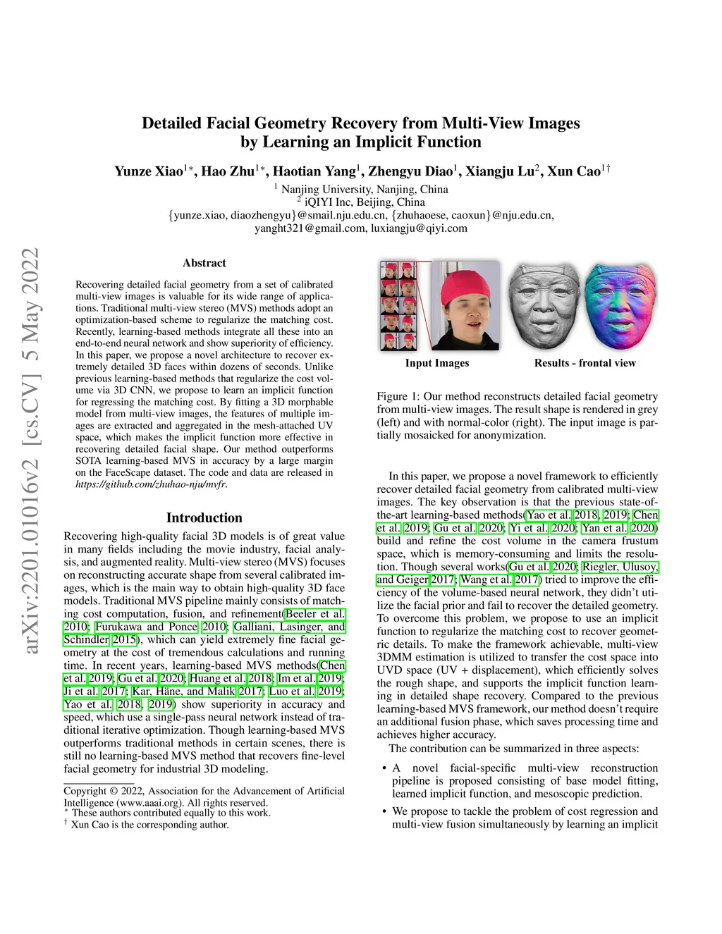 Recovering detailed facial geometry from a set of calibrated multi-view images is valuable for its wide range of applications. Traditional multi-view stereo (MVS) methods adopt an optimization-based scheme to regularize the matching cost. Recently, learning-based methods integrate all these into an end-to-end neural network and show superiority of efficiency. In this paper, we propose a novel architecture to recover extremely detailed 3D faces within dozens of seconds. Unlike previous learning-based methods that regularize the cost volume via 3D CNN, we propose to learn an implicit function for regressing the matching cost. By fitting a 3D morphable model from multi-view images, the features of multiple images are extracted and aggregated in the mesh-attached UV space, which makes the implicit function more effective in recovering detailed facial shape. Our method outperforms SOTA learning-based MVS in accuracy by a large margin on the FaceScape dataset. The code and data are released in https://github.com/zhuhao-nju/mvfr.