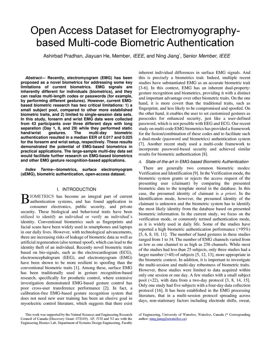 Open Access Dataset for Electromyography based Multi-code Biometric