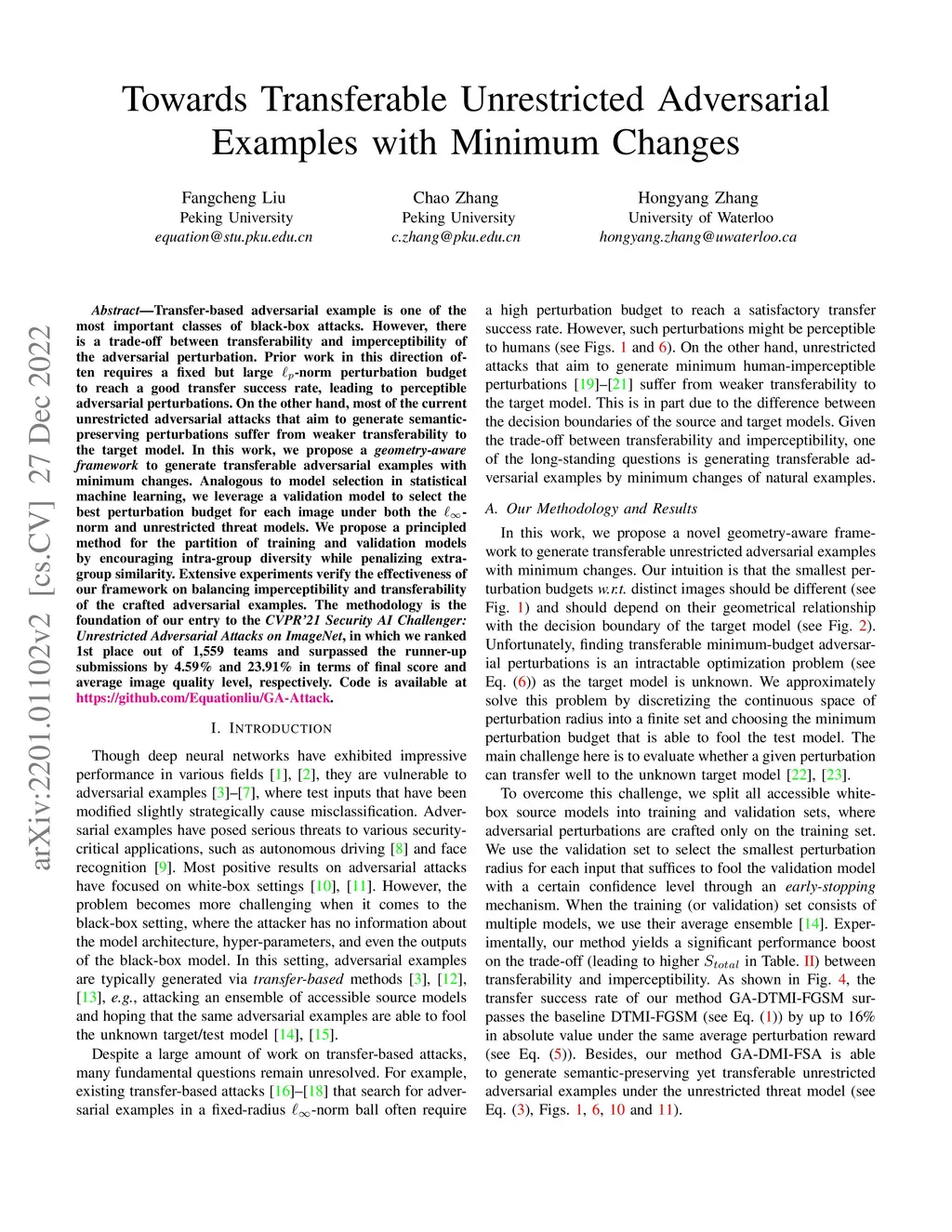 Transfer-based adversarial example is one of the most important classes of black-box attacks. However, there is a trade-off between transferability and imperceptibility of the adversarial perturbation. Prior work in this direction often requires a fixed but large -norm perturbation budget to reach a good transfer success rate, leading to perceptible adversarial perturbations. On the other hand, most of the current unrestricted adversarial attacks that aim to generate semantic-preserving perturbations suffer from weaker transferability to the target model. In this work, we propose a geometry-aware framework to generate transferable adversarial examples with minimum changes. Analogous to model selection in statistical machine learning, we leverage a validation model to select the optimal perturbation budget for each image under both the -norm and unrestricted threat models. Extensive experiments verify the effectiveness of our framework on balancing imperceptibility and transferability of the crafted adversarial examples. The methodology is the foundation of our entry to the CVPR'21 Security AI Challenger: Unrestricted Adversarial Attacks on ImageNet, in which we ranked 1st place out of 1,559 teams and surpassed the runner-up submissions by 4.59% and 23.91% in terms of final score and average image quality level, respectively. Code is available at https://github.com/Equationliu/GA-Attack.