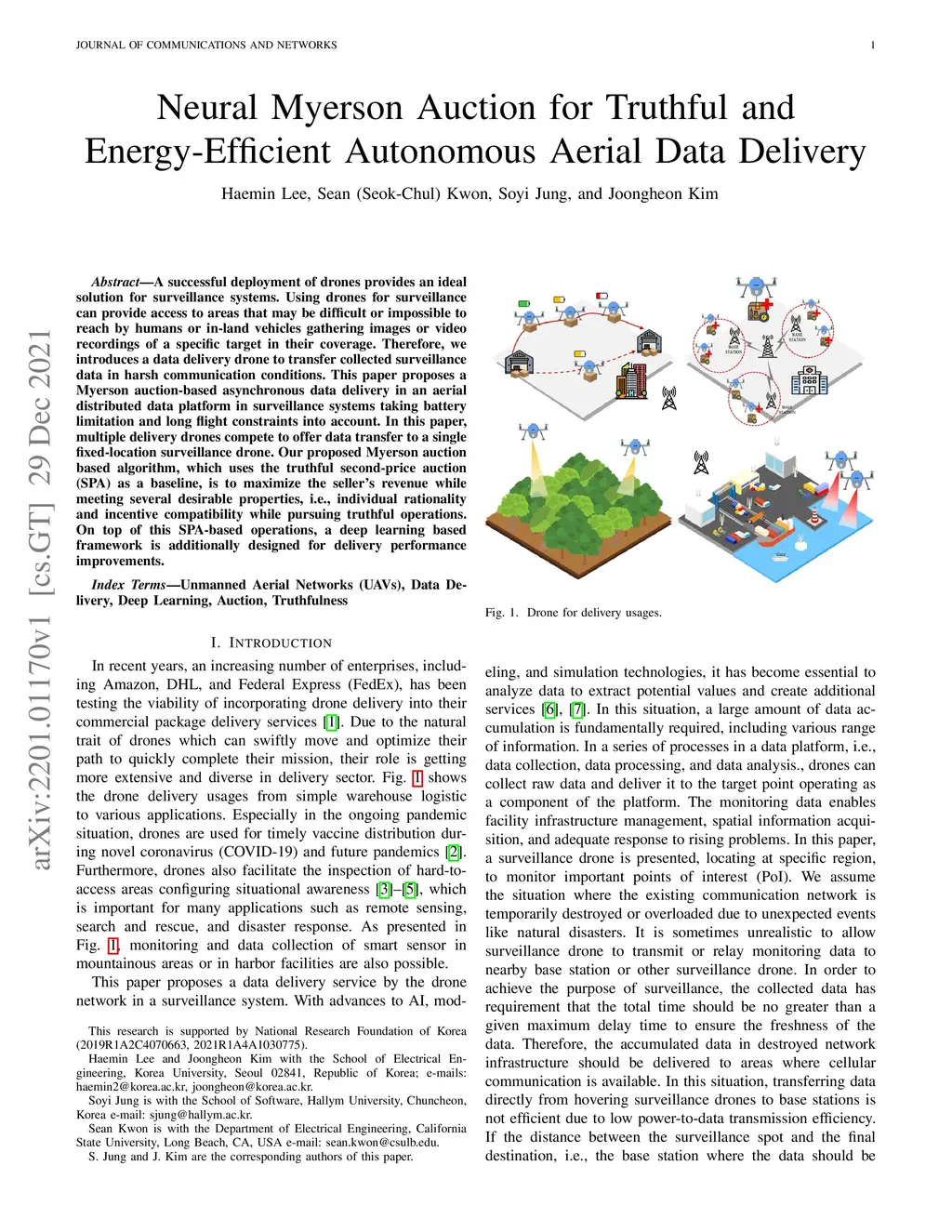 A successful deployment of drones provides an ideal solution for surveillance systems. Using drones for surveillance can provide access to areas that may be difficult or impossible to reach by humans or in-land vehicles gathering images or video recordings of a specific target in their coverage. Therefore, we introduces a data delivery drone to transfer collected surveillance data in harsh communication conditions. This paper proposes a Myerson auction-based asynchronous data delivery in an aerial distributed data platform in surveillance systems taking battery limitation and long flight constraints into account. In this paper, multiple delivery drones compete to offer data transfer to a single fixed-location surveillance drone. Our proposed Myerson auction-based algorithm, which uses the truthful second-price auction (SPA) as a baseline, is to maximize the seller's revenue while meeting several desirable properties, i.e., individual rationality and incentive compatibility while pursuing truthful operations. On top of these SPA-based operations, a deep learning-based framework is additionally designed for delivery performance improvements.