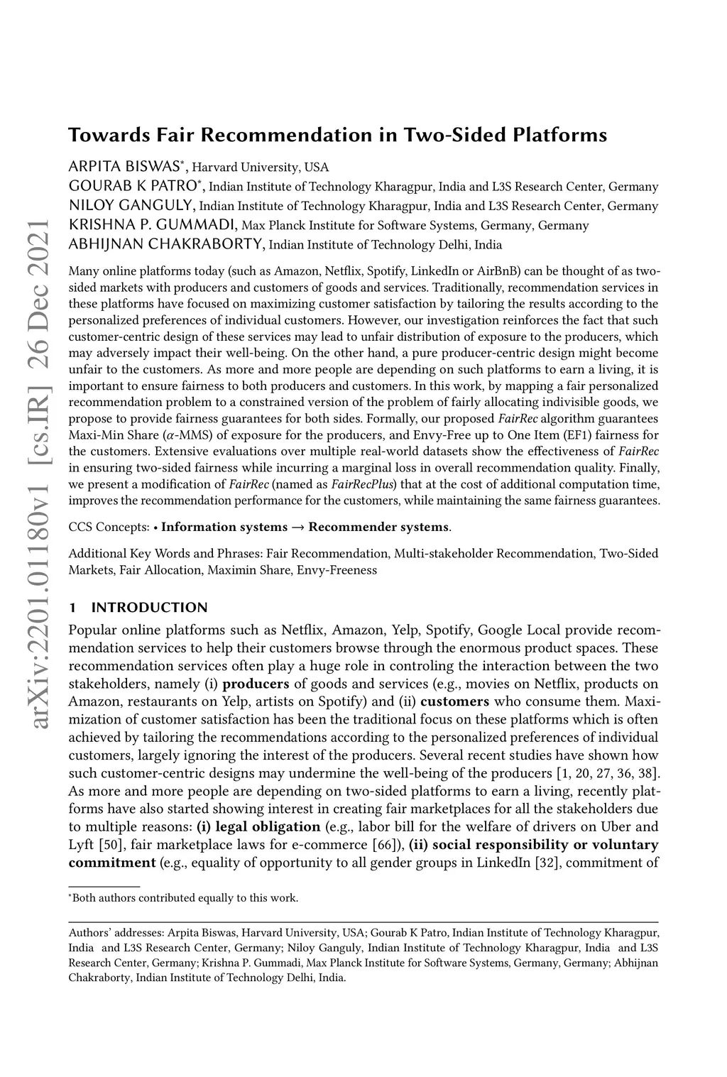 Many online platforms today (such as Amazon, Netflix, Spotify, LinkedIn, and AirBnB) can be thought of as two-sided markets with producers and customers of goods and services. Traditionally, recommendation services in these platforms have focused on maximizing customer satisfaction by tailoring the results according to the personalized preferences of individual customers. However, our investigation reinforces the fact that such customer-centric design of these services may lead to unfair distribution of exposure to the producers, which may adversely impact their well-being. On the other hand, a pure producer-centric design might become unfair to the customers. As more and more people are depending on such platforms to earn a living, it is important to ensure fairness to both producers and customers. In this work, by mapping a fair personalized recommendation problem to a constrained version of the problem of fairly allocating indivisible goods, we propose to provide fairness guarantees for both sides. Formally, our proposed {\em FairRec} algorithm guarantees Maxi-Min Share (-MMS) of exposure for the producers, and Envy-Free up to One Item (EF1) fairness for the customers. Extensive evaluations over multiple real-world datasets show the effectiveness of {\em FairRec} in ensuring two-sided fairness while incurring a marginal loss in overall recommendation quality. Finally, we present a modification of FairRec (named as FairRecPlus) that at the cost of additional computation time, improves the recommendation performance for the customers, while maintaining the same fairness guarantees.
