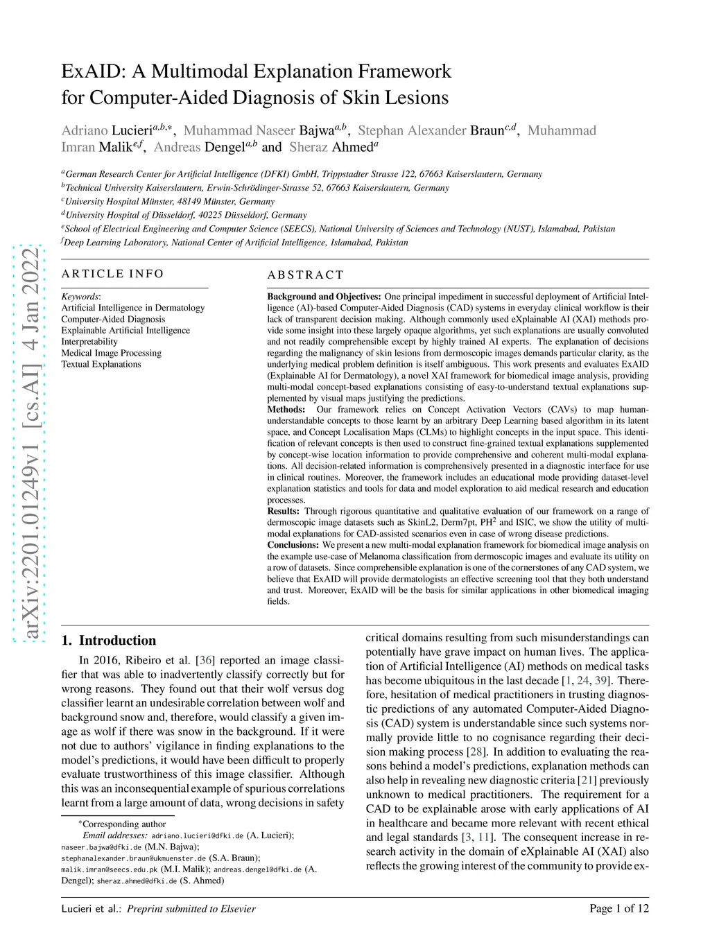 One principal impediment in the successful deployment of AI-based Computer-Aided Diagnosis (CAD) systems in clinical workflows is their lack of transparent decision making. Although commonly used eXplainable AI methods provide some insight into opaque algorithms, such explanations are usually convoluted and not readily comprehensible except by highly trained experts. The explanation of decisions regarding the malignancy of skin lesions from dermoscopic images demands particular clarity, as the underlying medical problem definition is itself ambiguous. This work presents ExAID (Explainable AI for Dermatology), a novel framework for biomedical image analysis, providing multi-modal concept-based explanations consisting of easy-to-understand textual explanations supplemented by visual maps justifying the predictions. ExAID relies on Concept Activation Vectors to map human concepts to those learnt by arbitrary Deep Learning models in latent space, and Concept Localization Maps to highlight concepts in the input space. This identification of relevant concepts is then used to construct fine-grained textual explanations supplemented by concept-wise location information to provide comprehensive and coherent multi-modal explanations. All information is comprehensively presented in a diagnostic interface for use in clinical routines. An educational mode provides dataset-level explanation statistics and tools for data and model exploration to aid medical research and education. Through rigorous quantitative and qualitative evaluation of ExAID, we show the utility of multi-modal explanations for CAD-assisted scenarios even in case of wrong predictions. We believe that ExAID will provide dermatologists an effective screening tool that they both understand and trust. Moreover, it will be the basis for similar applications in other biomedical imaging fields.