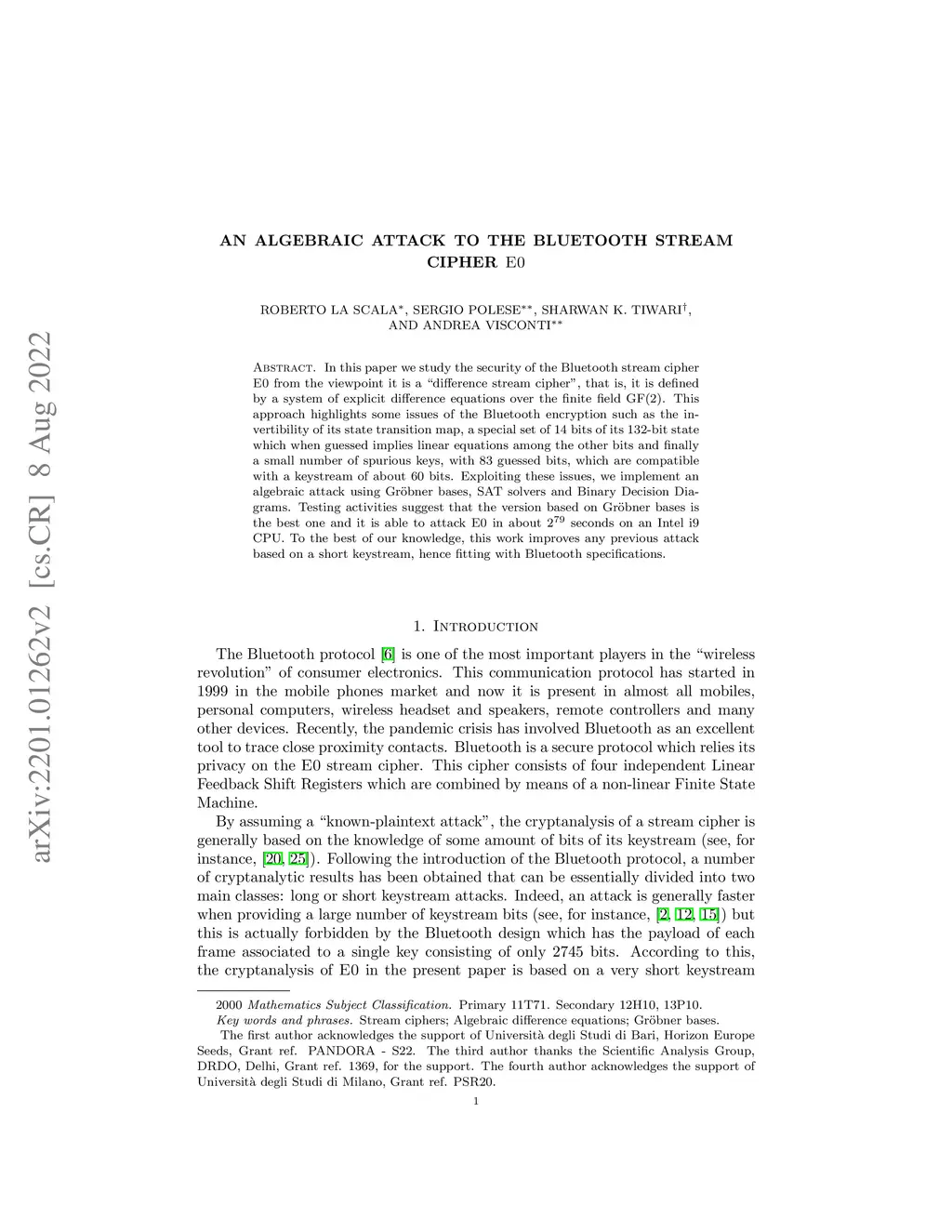 In this paper we study the security of the Bluetooth stream cipher E0 from the viewpoint it is a "difference stream cipher", that is, it is defined by a system of explicit difference equations over the finite field GF(2). This approach highlights some issues of the Bluetooth encryption such as the invertibility of its state transition map, a special set of 14 bits of its 132-bit state which when guessed implies linear equations among the other bits and finally a small number of spurious keys, with 83 guessed bits, which are compatible with a keystream of about 60 bits. Exploiting these issues, we implement an algebraic attack using Gr\"obner bases, SAT solvers and Binary Decision Diagrams. Testing activities suggest that the version based on Gr\"obner bases is the best one and it is able to attack E0 in about 2^79 seconds on an Intel i9 CPU. To the best of our knowledge, this work improves any previous attack based on a short keystream, hence fitting with Bluetooth specifications.