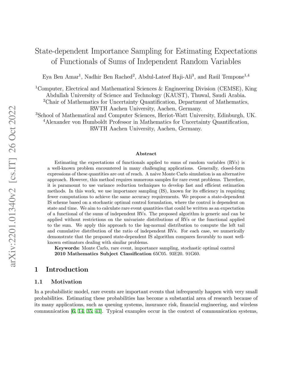 Estimating the expectations of functionals applied to sums of random variables (RVs) is a well-known problem encountered in many challenging applications. Generally, closed-form expressions of these quantities are out of reach. A naive Monte Carlo simulation is an alternative approach. However, this method requires numerous samples for rare event problems. Therefore, it is paramount to use variance reduction techniques to develop fast and efficient estimation methods. In this work, we use importance sampling (IS), known for its efficiency in requiring fewer computations to achieve the same accuracy requirements. We propose a state-dependent IS scheme based on a stochastic optimal control formulation, where the control is dependent on state and time. We aim to calculate rare event quantities that could be written as an expectation of a functional of the sums of independent RVs. The proposed algorithm is generic and can be applied without restrictions on the univariate distributions of RVs or the functional applied to the sum. We apply this approach to the log-normal distribution to compute the left tail and cumulative distribution of the ratio of independent RVs. For each case, we numerically demonstrate that the proposed state-dependent IS algorithm compares favorably to most well-known estimators dealing with similar problems.