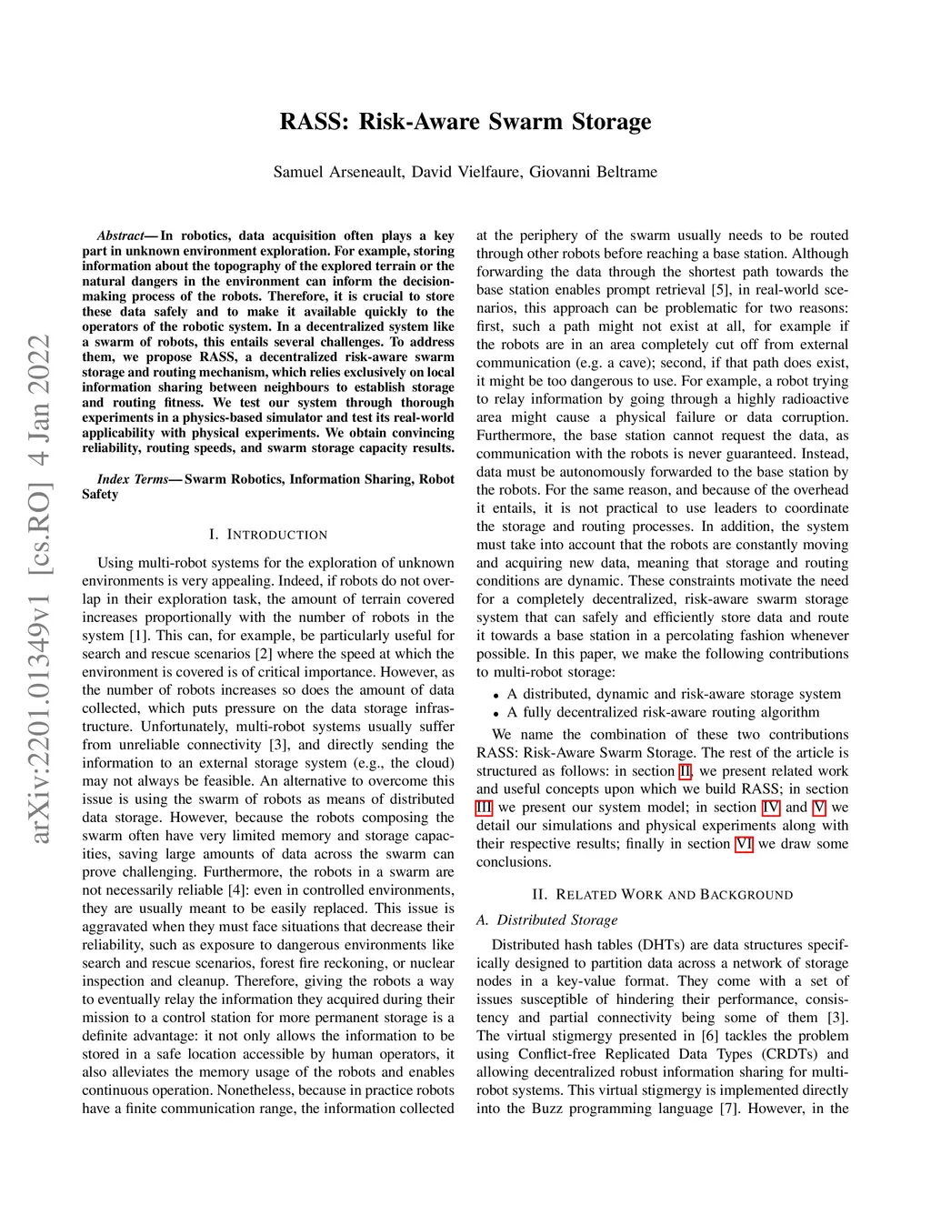 In robotics, data acquisition often plays a key part in unknown environment exploration. For example, storing information about the topography of the explored terrain or the natural dangers in the environment can inform the decision-making process of the robots. Therefore, it is crucial to store these data safely and to make it available quickly to the operators of the robotic system. In a decentralized system like a swarm of robots, this entails several challenges. To address them, we propose RASS, a decentralized risk-aware swarm storage and routing mechanism, which relies exclusively on local information sharing between neighbours to establish storage and routing fitness. We test our system through thorough experiments in a physics-based simulator and test its real-world applicability with physical experiments. We obtain convincing reliability, routing speeds, and swarm storage capacity results.