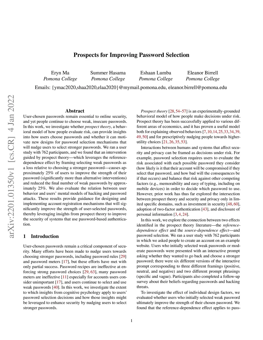 User-chosen passwords remain essential to online security, and yet people continue to choose weak, insecure passwords. In this work, we investigate whether prospect theory, a behavioral model of how people evaluate risk, can provide insights into how users choose passwords and whether it can motivate new designs for password selection mechanisms that will nudge users to select stronger passwords. We ran a user study with 762 participants, and we found that an intervention guided by prospect theory -- which leverages the reference-dependence effect by framing selecting weak passwords as a loss relative to choosing a stronger password -- causes approximately 25% of users to improve the strength of their password (significantly more than alternative interventions) and reduced the final number of weak passwords by approximately 25%. We also evaluate the relation between user behavior and users' mental models of hacking and password attacks. These results provide guidance for designing and implementing account registration mechanisms that will significantly improve the strength of user-selected passwords, thereby leveraging insights from prospect theory to improve the security of systems that use password-based authentication.