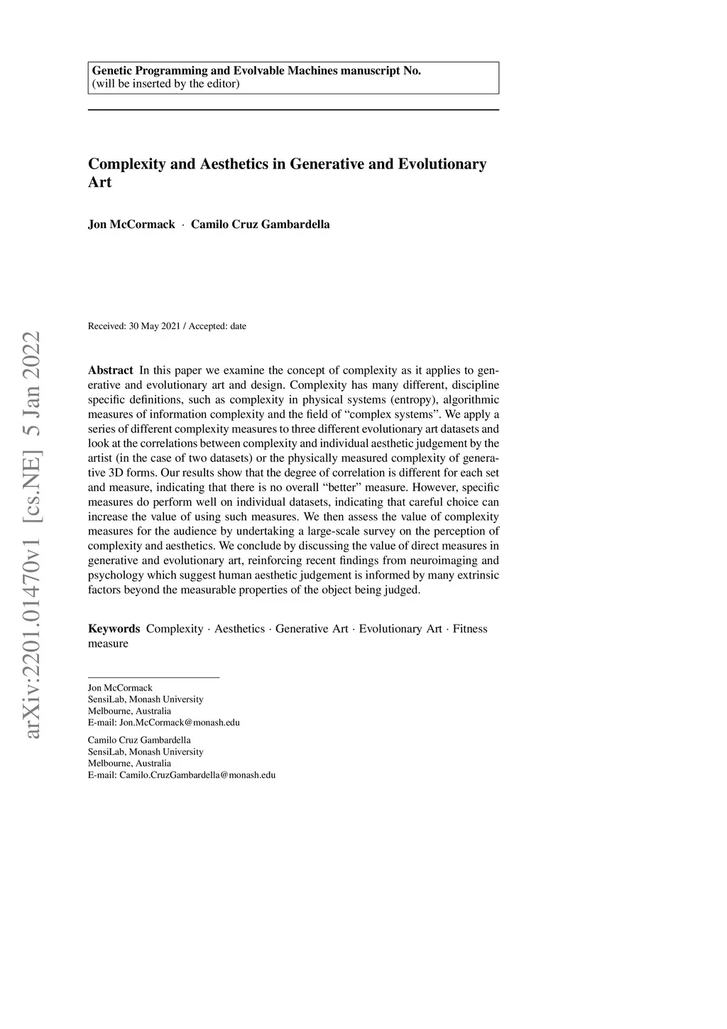 Complexity and Aesthetics in Generative and Evolutionary Art
