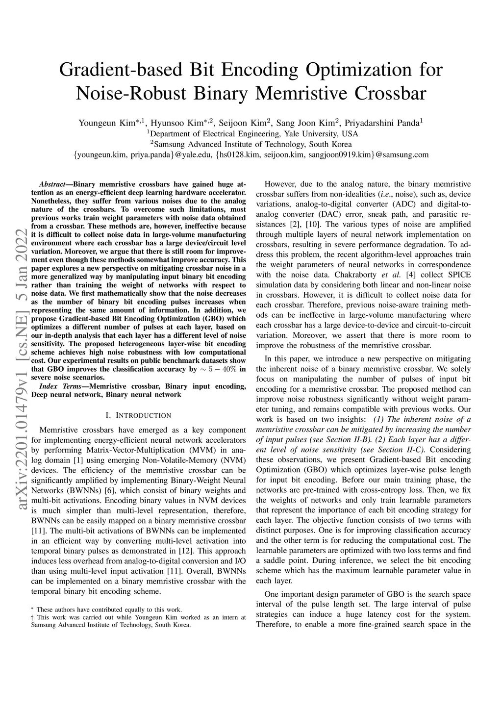 Binary memristive crossbars have gained huge attention as an energy-efficient deep learning hardware accelerator. Nonetheless, they suffer from various noises due to the analog nature of the crossbars. To overcome such limitations, most previous works train weight parameters with noise data obtained from a crossbar. These methods are, however, ineffective because it is difficult to collect noise data in large-volume manufacturing environment where each crossbar has a large device/circuit level variation. Moreover, we argue that there is still room for improvement even though these methods somewhat improve accuracy. This paper explores a new perspective on mitigating crossbar noise in a more generalized way by manipulating input binary bit encoding rather than training the weight of networks with respect to noise data. We first mathematically show that the noise decreases as the number of binary bit encoding pulses increases when representing the same amount of information. In addition, we propose Gradient-based Bit Encoding Optimization (GBO) which optimizes a different number of pulses at each layer, based on our in-depth analysis that each layer has a different level of noise sensitivity. The proposed heterogeneous layer-wise bit encoding scheme achieves high noise robustness with low computational cost. Our experimental results on public benchmark datasets show that GBO improves the classification accuracy by ~5-40% in severe noise scenarios.