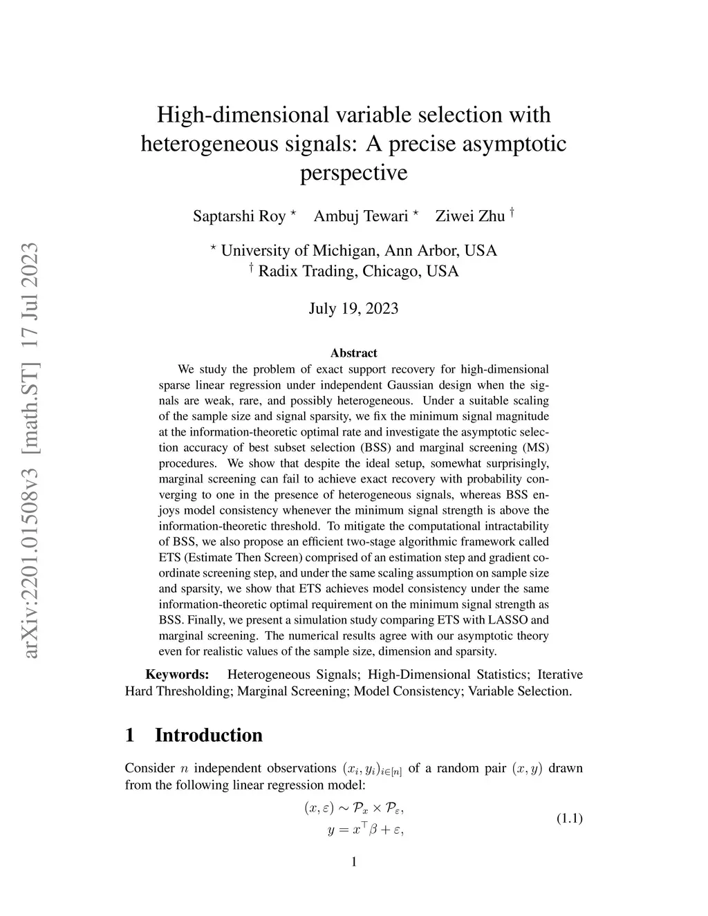 We study the problem of exact support recovery for high-dimensional sparse linear regression under independent Gaussian design when the signals are weak, rare, and possibly heterogeneous. Under a suitable scaling of the sample size and signal sparsity, we fix the minimum signal magnitude at the information-theoretic optimal rate and investigate the asymptotic selection accuracy of best subset selection (BSS) and marginal screening (MS) procedures. We show that despite the ideal setup, somewhat surprisingly, marginal screening can fail to achieve exact recovery with probability converging to one in the presence of heterogeneous signals, whereas BSS enjoys model consistency whenever the minimum signal strength is above the information-theoretic threshold. To mitigate the computational intractability of BSS, we also propose an efficient two-stage algorithmic framework called ETS (Estimate Then Screen) comprised of an estimation step and gradient coordinate screening step, and under the same scaling assumption on sample size and sparsity, we show that ETS achieves model consistency under the same information-theoretic optimal requirement on the minimum signal strength as BSS. Finally, we present a simulation study comparing ETS with LASSO and marginal screening. The numerical results agree with our asymptotic theory even for realistic values of the sample size, dimension and sparsity.