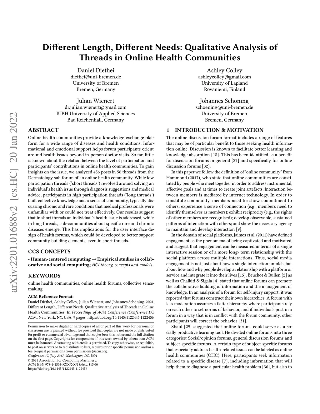 Online health communities provide a knowledge exchange platform for a wide range of diseases and health conditions. Informational and emotional support helps forum participants orient around health issues beyond in-person doctor visits. So far, little is known about the relation between the level of participation and participants' contributions in online health communities. To gain insights on the issue, we analyzed 456 posts in 56 threads from the Dermatology sub-forum of an online health community. While low participation threads (short threads) revolved around solving an individual's health issue through diagnosis suggestions and medical advice, participants in high participation threads (long threads) built collective knowledge and a sense of community, typically discussing chronic and rare conditions that medical professionals were unfamiliar with or could not treat effectively. Our results suggest that in short threads an individual's health issue is addressed, while in long threads, sub-communities about specific rare and chronic diseases emerge. This has implications for the user interface design of health forums, which could be developed to better support community building elements, even in short threads.