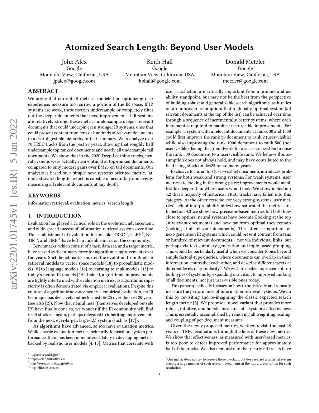 We argue that current IR metrics, modeled on optimizing user experience, measure too narrow a portion of the IR space. If IR systems are weak, these metrics undersample or completely filter out the deeper documents that need improvement. If IR systems are relatively strong, these metrics undersample deeper relevant documents that could underpin even stronger IR systems, ones that could present content from tens or hundreds of relevant documents in a user-digestible hierarchy or text summary. We reanalyze over 70 TREC tracks from the past 28 years, showing that roughly half undersample top ranked documents and nearly all undersample tail documents. We show that in the 2020 Deep Learning tracks, neural systems were actually near-optimal at top-ranked documents, compared to only modest gains over BM25 on tail documents. Our analysis is based on a simple new systems-oriented metric, átomized search length', which is capable of accurately and evenly measuring all relevant documents at any depth.