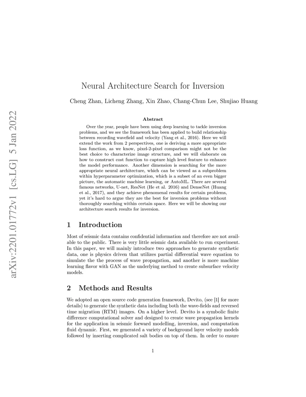 Over the year, people have been using deep learning to tackle inversion problems, and we see the framework has been applied to build relationship between recording wavefield and velocity (Yang et al., 2016). Here we will extend the work from 2 perspectives, one is deriving a more appropriate loss function, as we now, pixel-2-pixel comparison might not be the best choice to characterize image structure, and we will elaborate on how to construct cost function to capture high level feature to enhance the model performance. Another dimension is searching for the more appropriate neural architecture, which is a subset of an even bigger picture, the automatic machine learning, or AutoML. There are several famous networks, U-net, ResNet (He et al., 2016) and DenseNet (Huang et al., 2017), and they achieve phenomenal results for certain problems, yet it's hard to argue they are the best for inversion problems without thoroughly searching within certain space. Here we will be showing our architecture search results for inversion.