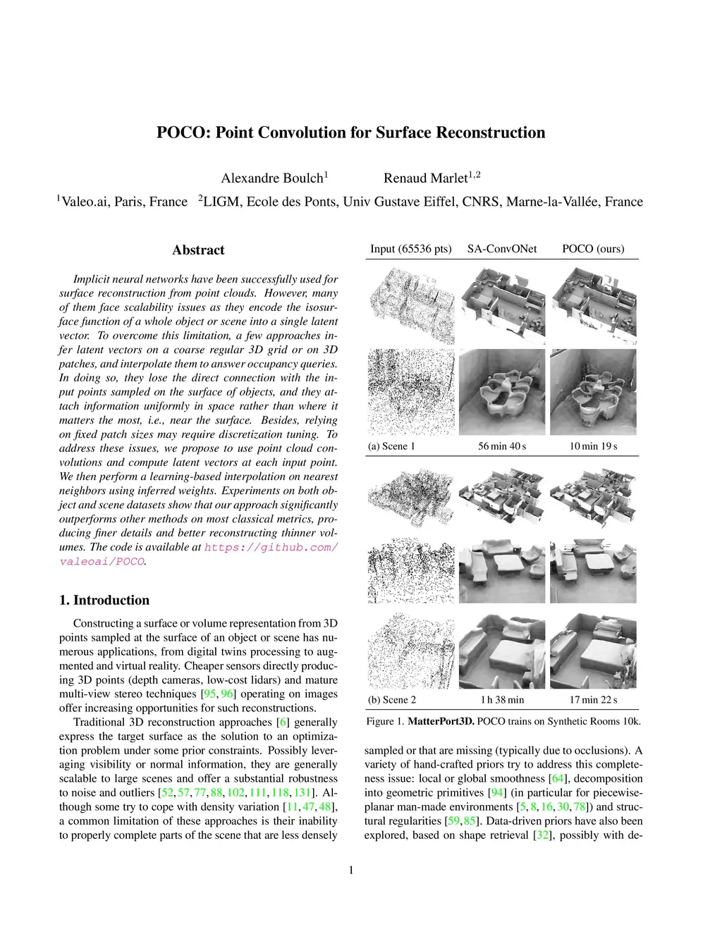Implicit neural networks have been successfully used for surface reconstruction from point clouds. However, many of them face scalability issues as they encode the isosurface function of a whole object or scene into a single latent vector. To overcome this limitation, a few approaches infer latent vectors on a coarse regular 3D grid or on 3D patches, and interpolate them to answer occupancy queries. In doing so, they loose the direct connection with the input points sampled on the surface of objects, and they attach information uniformly in space rather than where it matters the most, i.e., near the surface. Besides, relying on fixed patch sizes may require discretization tuning. To address these issues, we propose to use point cloud convolutions and compute latent vectors at each input point. We then perform a learning-based interpolation on nearest neighbors using inferred weights. Experiments on both object and scene datasets show that our approach significantly outperforms other methods on most classical metrics, producing finer details and better reconstructing thinner volumes. The code is available at https://github.com/valeoai/POCO.