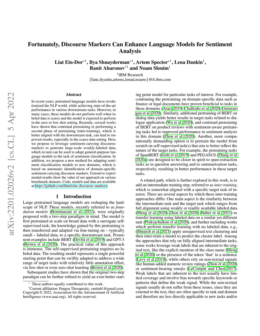 In recent years, pretrained language models have revolutionized the NLP world, while achieving state of the art performance in various downstream tasks. However, in many cases, these models do not perform well when labeled data is scarce and the model is expected to perform in the zero or few shot setting. Recently, several works have shown that continual pretraining or performing a second phase of pretraining (inter-training) which is better aligned with the downstream task, can lead to improved results, especially in the scarce data setting. Here, we propose to leverage sentiment-carrying discourse markers to generate large-scale weakly-labeled data, which in turn can be used to adapt language models for sentiment analysis. Extensive experimental results show the value of our approach on various benchmark datasets, including the finance domain. Code, models and data are available at https://github.com/ibm/tslm-discourse-markers.