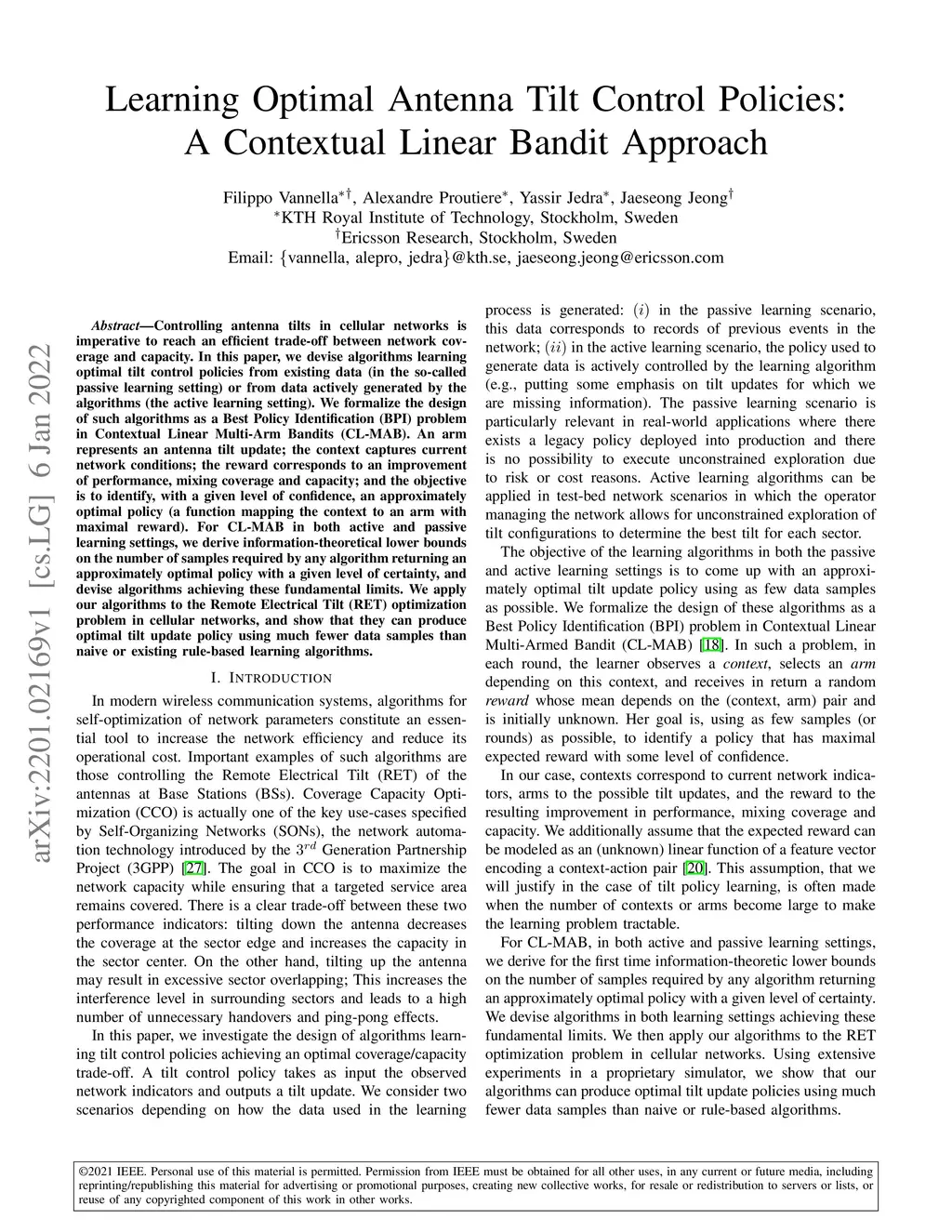 Controlling antenna tilts in cellular networks is imperative to reach an efficient trade-off between network coverage and capacity. In this paper, we devise algorithms learning optimal tilt control policies from existing data (in the so-called passive learning setting) or from data actively generated by the algorithms (the active learning setting). We formalize the design of such algorithms as a Best Policy Identification (BPI) problem in Contextual Linear Multi-Arm Bandits (CL-MAB). An arm represents an antenna tilt update; the context captures current network conditions; the reward corresponds to an improvement of performance, mixing coverage and capacity; and the objective is to identify, with a given level of confidence, an approximately optimal policy (a function mapping the context to an arm with maximal reward). For CL-MAB in both active and passive learning settings, we derive information-theoretical lower bounds on the number of samples required by any algorithm returning an approximately optimal policy with a given level of certainty, and devise algorithms achieving these fundamental limits. We apply our algorithms to the Remote Electrical Tilt (RET) optimization problem in cellular networks, and show that they can produce optimal tilt update policy using much fewer data samples than naive or existing rule-based learning algorithms.