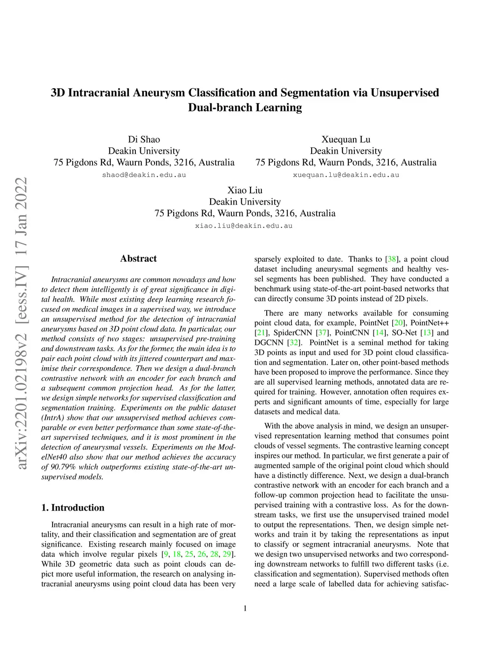 Intracranial aneurysms are common nowadays and how to detect them intelligently is of great significance in digital health. While most existing deep learning research focused on medical images in a supervised way, we introduce an unsupervised method for the detection of intracranial aneurysms based on 3D point cloud data. In particular, our method consists of two stages: unsupervised pre-training and downstream tasks. As for the former, the main idea is to pair each point cloud with its jittered counterpart and maximise their correspondence. Then we design a dual-branch contrastive network with an encoder for each branch and a subsequent common projection head. As for the latter, we design simple networks for supervised classification and segmentation training. Experiments on the public dataset (IntrA) show that our unsupervised method achieves comparable or even better performance than some state-of-the-art supervised techniques, and it is most prominent in the detection of aneurysmal vessels. Experiments on the ModelNet40 also show that our method achieves the accuracy of 90.79\% which outperforms existing state-of-the-art unsupervised models.