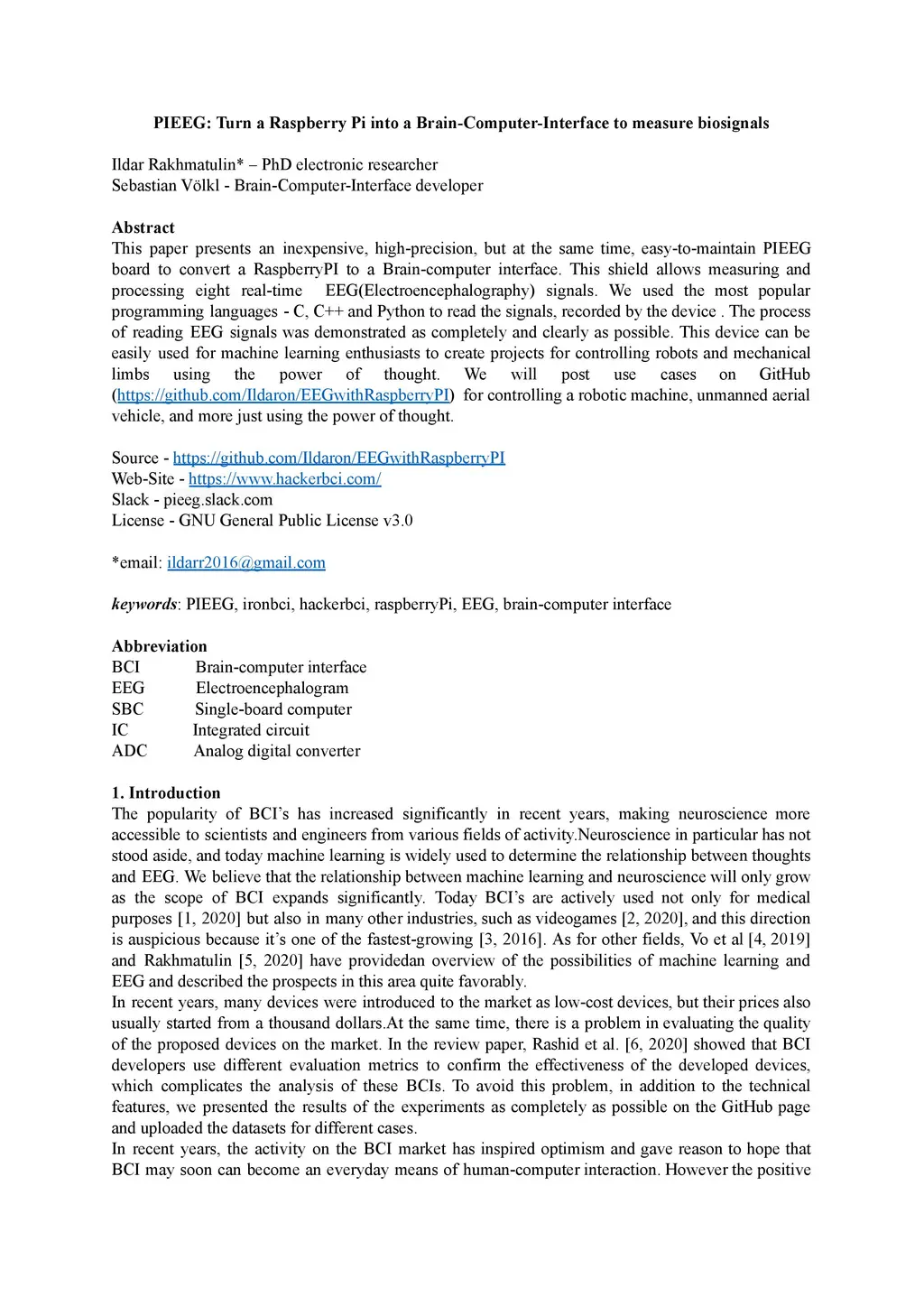 This paper presents an inexpensive, high-precision, but at the same time, easy-to-maintain PIEEG board to convert a RaspberryPI to a Brain-computer interface. This shield allows measuring and processing eight real-time EEG (Electroencephalography) signals. We used the most popular programming languages - C, C++ and Python to read the signals, recorded by the device . The process of reading EEG signals was demonstrated as completely and clearly as possible. This device can be easily used for machine learning enthusiasts to create projects for controlling robots and mechanical limbs using the power of thought. We will post use cases on GitHub (https://github.com/Ildaron/EEGwithRaspberryPI) for controlling a robotic machine, unmanned aerial vehicle, and more just using the power of thought.