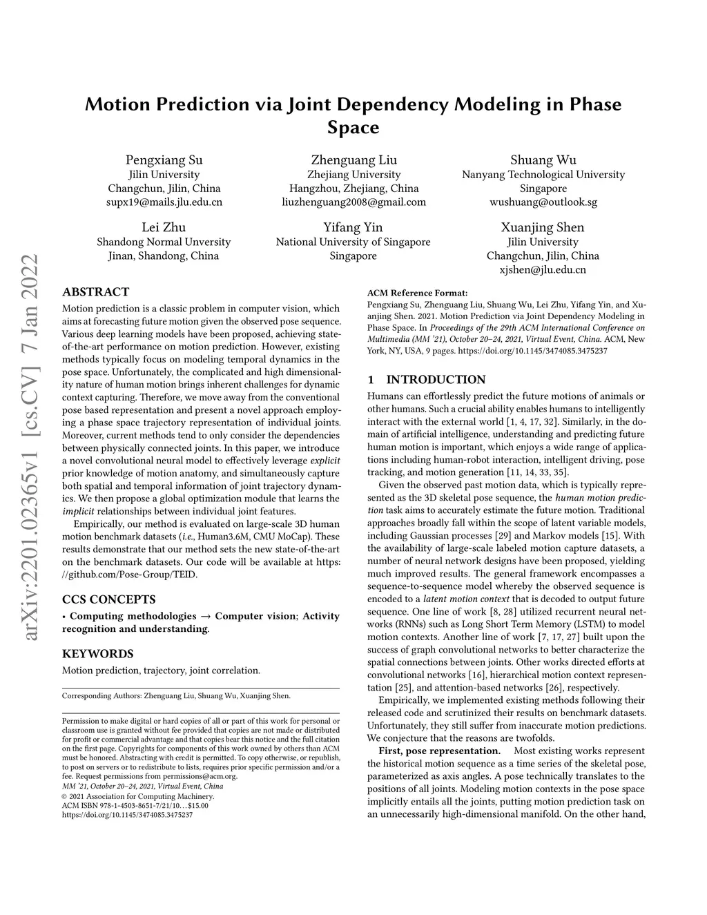Motion prediction is a classic problem in computer vision, which aims at forecasting future motion given the observed pose sequence. Various deep learning models have been proposed, achieving state-of-the-art performance on motion prediction. However, existing methods typically focus on modeling temporal dynamics in the pose space. Unfortunately, the complicated and high dimensionality nature of human motion brings inherent challenges for dynamic context capturing. Therefore, we move away from the conventional pose based representation and present a novel approach employing a phase space trajectory representation of individual joints. Moreover, current methods tend to only consider the dependencies between physically connected joints. In this paper, we introduce a novel convolutional neural model to effectively leverage explicit prior knowledge of motion anatomy, and simultaneously capture both spatial and temporal information of joint trajectory dynamics. We then propose a global optimization module that learns the implicit relationships between individual joint features. Empirically, our method is evaluated on large-scale 3D human motion benchmark datasets (i.e., Human3.6M, CMU MoCap). These results demonstrate that our method sets the new state-of-the-art on the benchmark datasets. Our code will be available at https://github.com/Pose-Group/TEID.