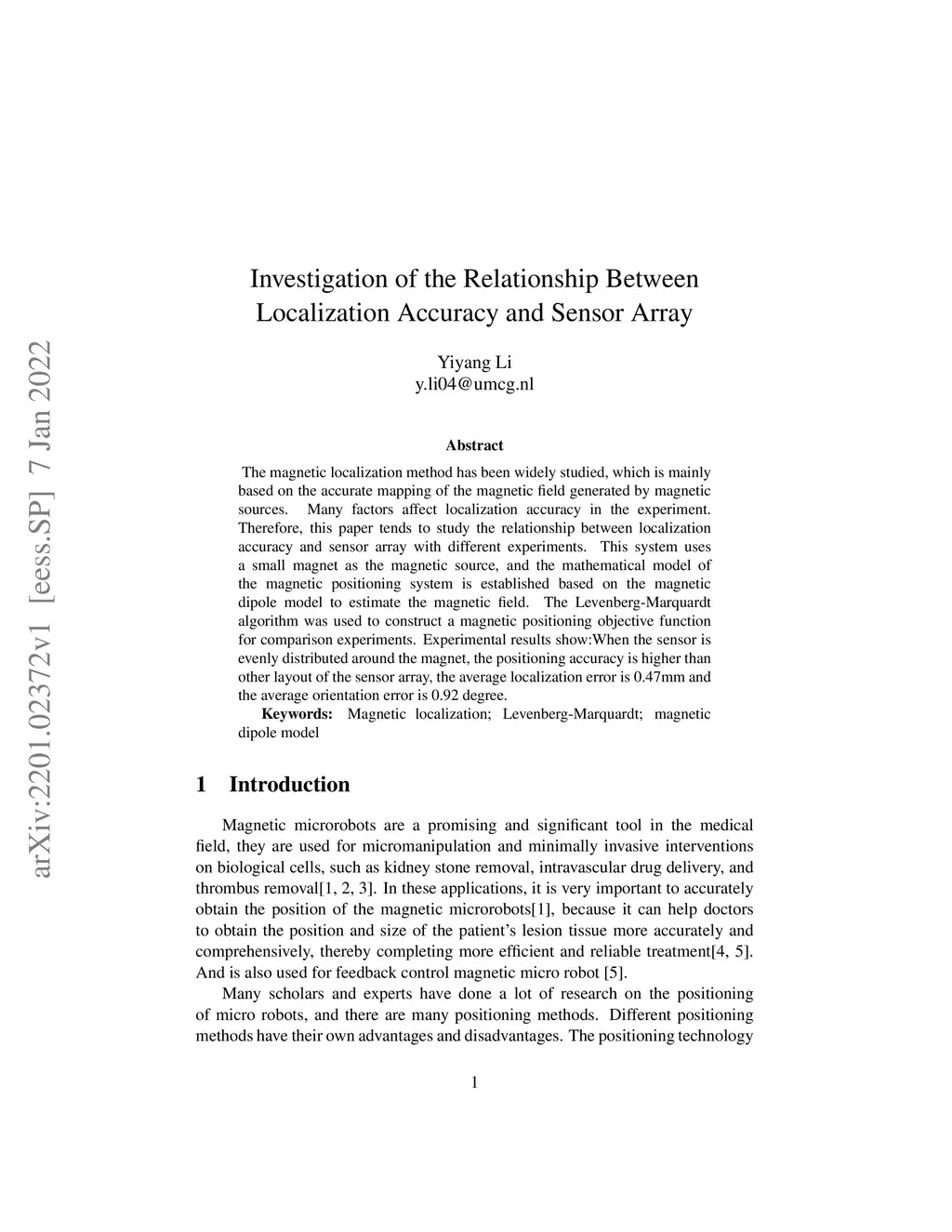 The magnetic localization method has been widely studied, which is mainly based on the accurate mapping of the magnetic field generated by magnetic sources. Many factors affect localization accuracy in the experiment. Therefore, this paper tends to study the relationship between localization accuracy and sensor array with different experiments. This system uses a small magnet as the magnetic source, and the mathematical model of the magnetic positioning system is established based on the magnetic dipole model to estimate the magnetic field. The Levenberg-Marquardt algorithm was used to construct a magnetic positioning objective function for comparison experiments. Experimental results show:When the sensor is evenly distributed around the magnet, the positioning accuracy is higher than other layout of the sensor array, the average localization error is 0.47mm and the average orientation error is 0.92 degree.
