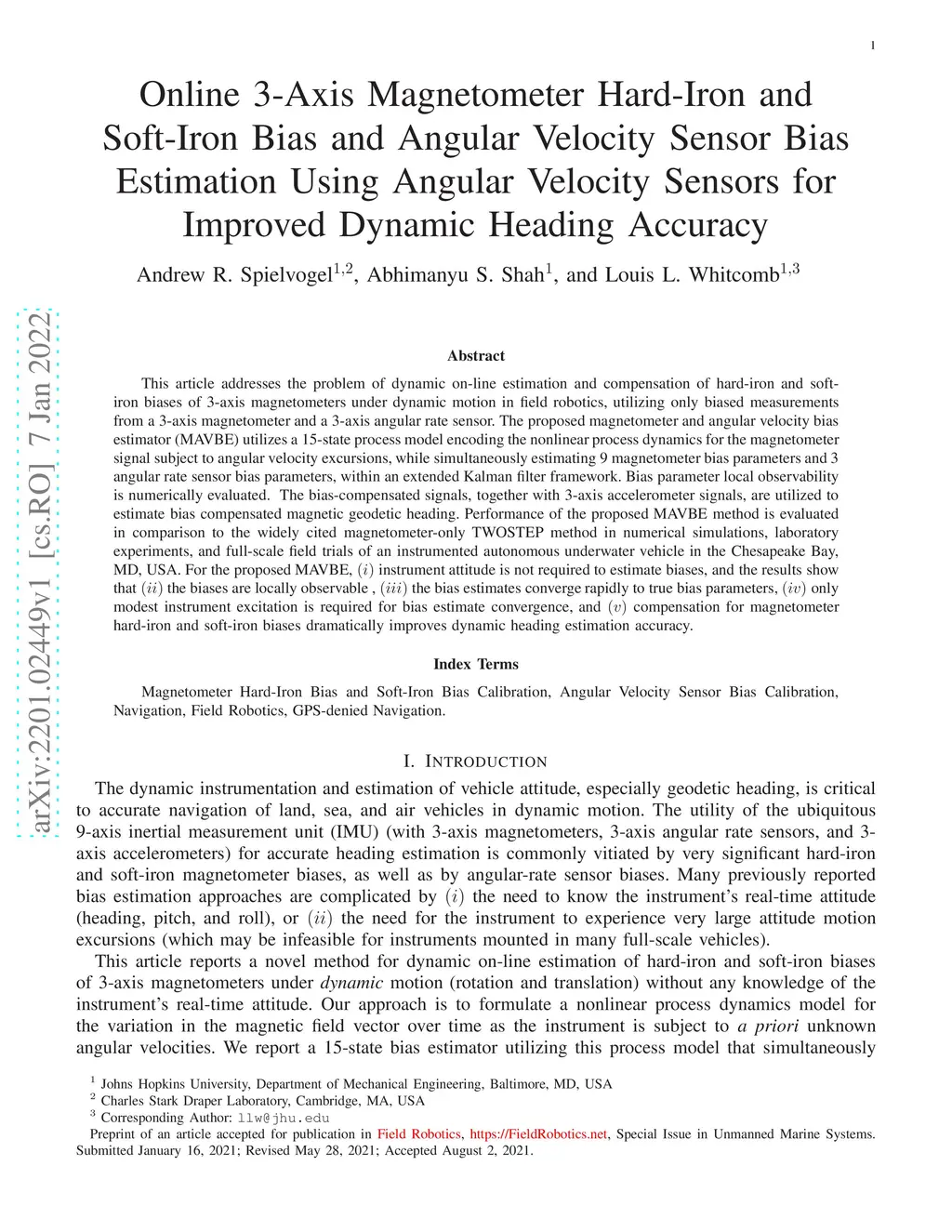 This article addresses the problem of dynamic on-line estimation and compensation of hard-iron and soft-iron biases of 3-axis magnetometers under dynamic motion in field robotics, utilizing only biased measurements from a 3-axis magnetometer and a 3-axis angular rate sensor. The proposed magnetometer and angular velocity bias estimator (MAVBE) utilizes a 15-state process model encoding the nonlinear process dynamics for the magnetometer signal subject to angular velocity excursions, while simultaneously estimating 9 magnetometer bias parameters and 3 angular rate sensor bias parameters, within an extended Kalman filter framework. Bias parameter local observability is numerically evaluated. The bias-compensated signals, together with 3-axis accelerometer signals, are utilized to estimate bias compensated magnetic geodetic heading. Performance of the proposed MAVBE method is evaluated in comparison to the widely cited magnetometer-only TWOSTEP method in numerical simulations, laboratory experiments, and full-scale field trials of an instrumented autonomous underwater vehicle in the Chesapeake Bay, MD, USA. For the proposed MAVBE, (i) instrument attitude is not required to estimate biases, and the results show that (ii) the biases are locally observable, (iii) the bias estimates converge rapidly to true bias parameters, (iv) only modest instrument excitation is required for bias estimate convergence, and (v) compensation for magnetometer hard-iron and soft-iron biases dramatically improves dynamic heading estimation accuracy.