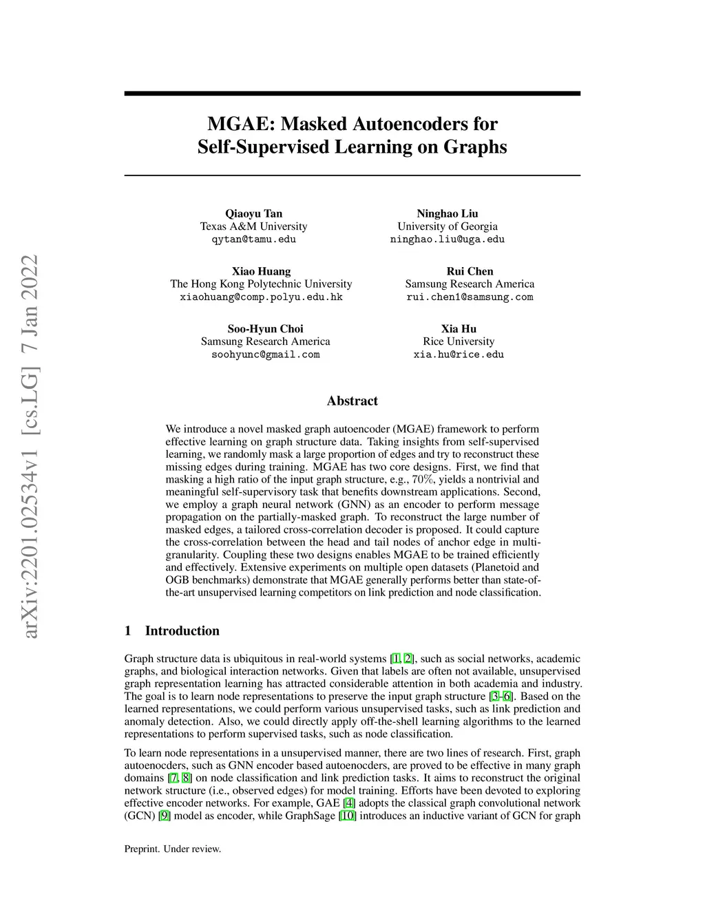 We introduce a novel masked graph autoencoder (MGAE) framework to perform effective learning on graph structure data. Taking insights from self-supervised learning, we randomly mask a large proportion of edges and try to reconstruct these missing edges during training. MGAE has two core designs. First, we find that masking a high ratio of the input graph structure, e.g., , yields a nontrivial and meaningful self-supervisory task that benefits downstream applications. Second, we employ a graph neural network (GNN) as an encoder to perform message propagation on the partially-masked graph. To reconstruct the large number of masked edges, a tailored cross-correlation decoder is proposed. It could capture the cross-correlation between the head and tail nodes of anchor edge in multi-granularity. Coupling these two designs enables MGAE to be trained efficiently and effectively. Extensive experiments on multiple open datasets (Planetoid and OGB benchmarks) demonstrate that MGAE generally performs better than state-of-the-art unsupervised learning competitors on link prediction and node classification.