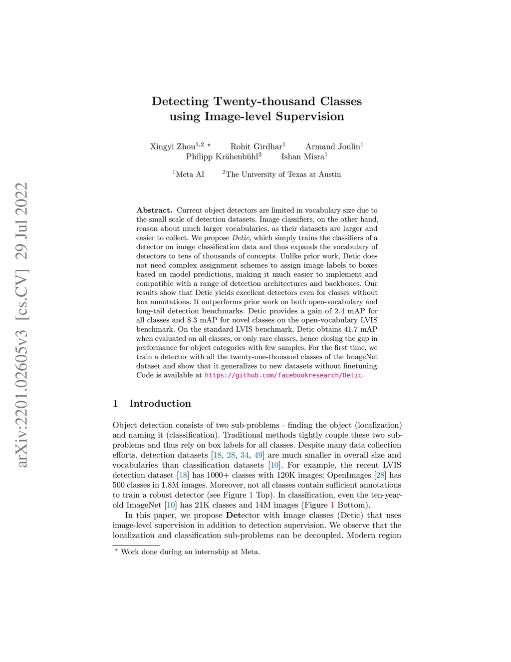 Current object detectors are limited in vocabulary size due to the small scale of detection datasets. Image classifiers, on the other hand, reason about much larger vocabularies, as their datasets are larger and easier to collect. We propose Detic, which simply trains the classifiers of a detector on image classification data and thus expands the vocabulary of detectors to tens of thousands of concepts. Unlike prior work, Detic does not need complex assignment schemes to assign image labels to boxes based on model predictions, making it much easier to implement and compatible with a range of detection architectures and backbones. Our results show that Detic yields excellent detectors even for classes without box annotations. It outperforms prior work on both open-vocabulary and long-tail detection benchmarks. Detic provides a gain of 2.4 mAP for all classes and 8.3 mAP for novel classes on the open-vocabulary LVIS benchmark. On the standard LVIS benchmark, Detic obtains 41.7 mAP when evaluated on all classes, or only rare classes, hence closing the gap in performance for object categories with few samples. For the first time, we train a detector with all the twenty-one-thousand classes of the ImageNet dataset and show that it generalizes to new datasets without finetuning. Code is available at \url{https://github.com/facebookresearch/Detic}.