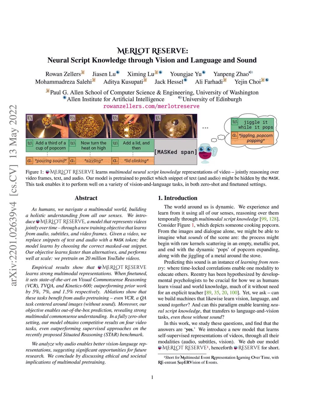 As humans, we navigate a multimodal world, building a holistic understanding from all our senses. We introduce MERLOT Reserve, a model that represents videos jointly over time -- through a new training objective that learns from audio, subtitles, and video frames. Given a video, we replace snippets of text and audio with a MASK token; the model learns by choosing the correct masked-out snippet. Our objective learns faster than alternatives, and performs well at scale: we pretrain on 20 million YouTube videos. Empirical results show that MERLOT Reserve learns strong multimodal representations. When finetuned, it sets state-of-the-art on Visual Commonsense Reasoning (VCR), TVQA, and Kinetics-600; outperforming prior work by 5%, 7%, and 1.5% respectively. Ablations show that these tasks benefit from audio pretraining -- even VCR, a QA task centered around images (without sound). Moreover, our objective enables out-of-the-box prediction, revealing strong multimodal commonsense understanding. In a fully zero-shot setting, our model obtains competitive results on four video tasks, even outperforming supervised approaches on the recently proposed Situated Reasoning (STAR) benchmark. We analyze why audio enables better vision-language representations, suggesting significant opportunities for future research. We conclude by discussing ethical and societal implications of multimodal pretraining.