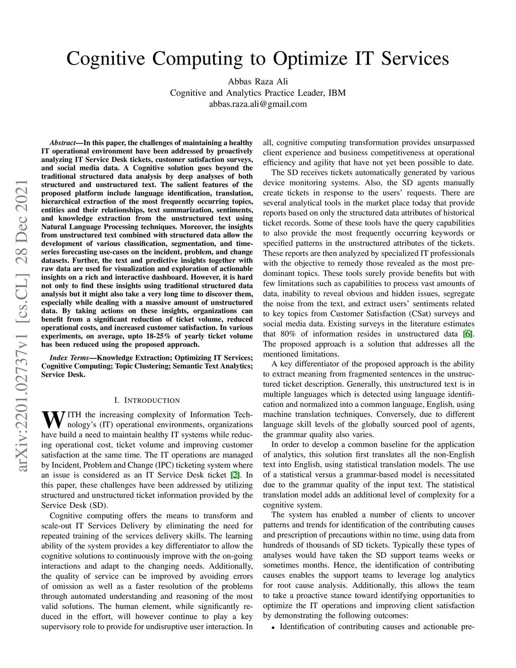 In this paper, the challenges of maintaining a healthy IT operational environment have been addressed by proactively analyzing IT Service Desk tickets, customer satisfaction surveys, and social media data. A Cognitive solution goes beyond the traditional structured data analysis by deep analyses of both structured and unstructured text. The salient features of the proposed platform include language identification, translation, hierarchical extraction of the most frequently occurring topics, entities and their relationships, text summarization, sentiments, and knowledge extraction from the unstructured text using Natural Language Processing techniques. Moreover, the insights from unstructured text combined with structured data allow the development of various classification, segmentation, and time-series forecasting use-cases on the incident, problem, and change datasets. Further, the text and predictive insights together with raw data are used for visualization and exploration of actionable insights on a rich and interactive dashboard. However, it is hard not only to find these insights using traditional structured data analysis but it might also take a very long time to discover them, especially while dealing with a massive amount of unstructured data. By taking action on these insights, organizations can benefit from a significant reduction of ticket volume, reduced operational costs, and increased customer satisfaction. In various experiments, on average, upto 18-25% of yearly ticket volume has been reduced using the proposed approach.