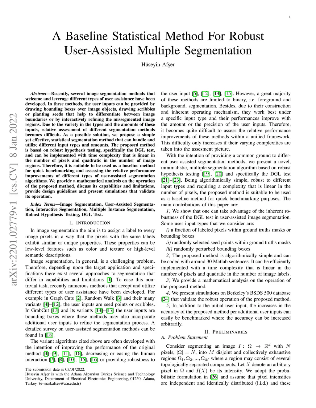 Recently, several image segmentation methods that welcome and leverage different types of user assistance have been developed. In these methods, the user inputs can be provided by drawing bounding boxes over image objects, drawing scribbles or planting seeds that help to differentiate between image boundaries or by interactively refining the missegmented image regions. Due to the variety in the types and the amounts of these inputs, relative assessment of different segmentation methods becomes difficult. As a possible solution, we propose a simple yet effective, statistical segmentation method that can handle and utilize different input types and amounts. The proposed method is based on robust hypothesis testing, specifically the DGL test, and can be implemented with time complexity that is linear in the number of pixels and quadratic in the number of image regions. Therefore, it is suitable to be used as a baseline method for quick benchmarking and assessing the relative performance improvements of different types of user-assisted segmentation algorithms. We provide a mathematical analysis on the operation of the proposed method, discuss its capabilities and limitations, provide design guidelines and present simulations that validate its operation.