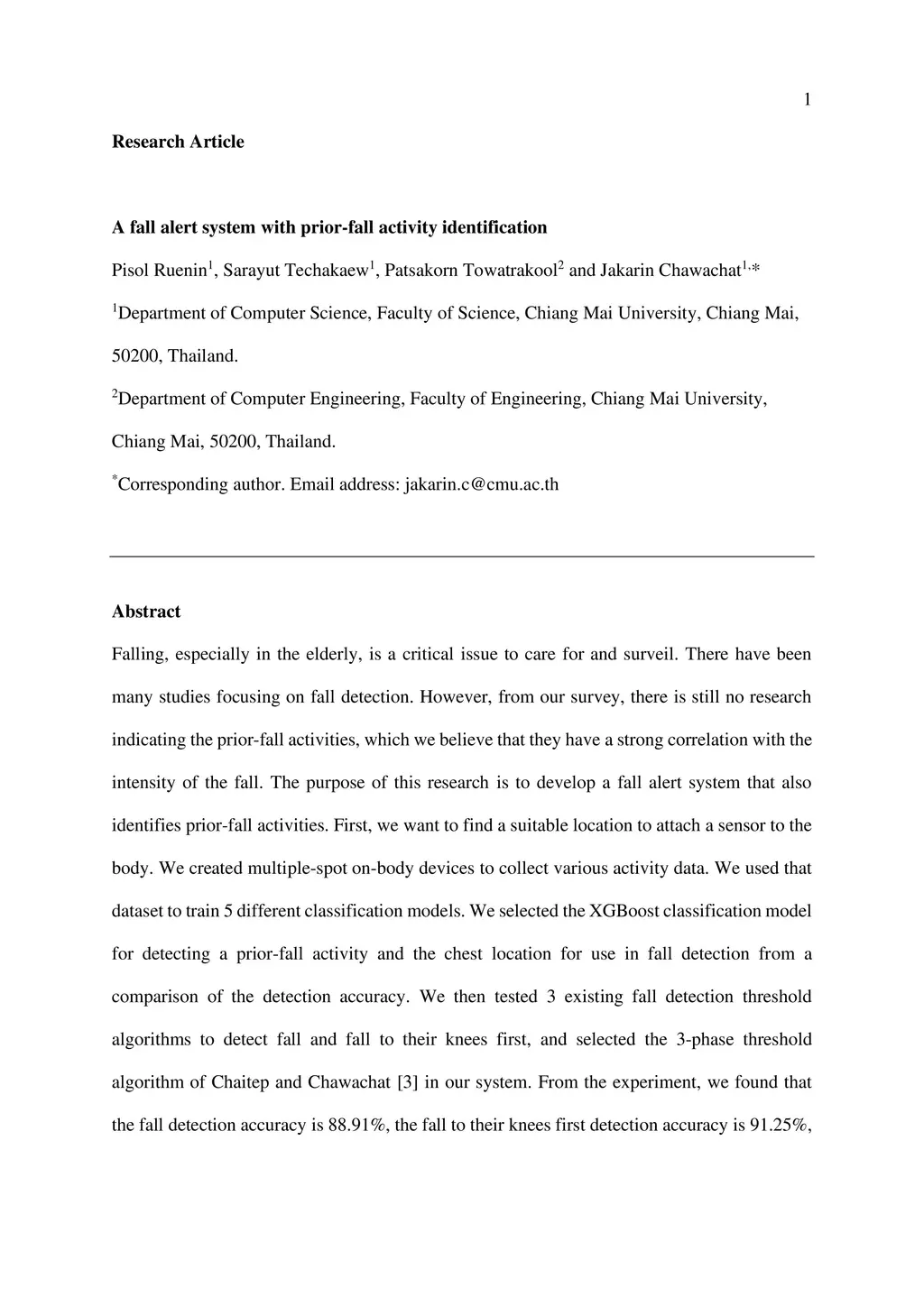 Falling, especially in the elderly, is a critical issue to care for and surveil. There have been many studies focusing on fall detection. However, from our survey, there is still no research indicating the prior-fall activities, which we believe that they have a strong correlation with the intensity of the fall. The purpose of this research is to develop a fall alert system that also identifies prior-fall activities. First, we want to find a suitable location to attach a sensor to the body. We created multiple-spot on-body devices to collect various activity data. We used that dataset to train 5 different classification models. We selected the XGBoost classification model for detecting a prior-fall activity and the chest location for use in fall detection from a comparison of the detection accuracy. We then tested 3 existing fall detection threshold algorithms to detect fall and fall to their knees first, and selected the 3-phase threshold algorithm of Chaitep and Chawachat [3] in our system. From the experiment, we found that the fall detection accuracy is 88.91%, the fall to their knees first detection accuracy is 91.25%, and the average accuracy of detection of prior-fall activities is 86.25%. Although we use an activity dataset of young to middle-aged adults (18-49 years), we are confident that this system can be developed to monitor activities before the fall, especially in the elderly, so that caretakers can better manage the situation.