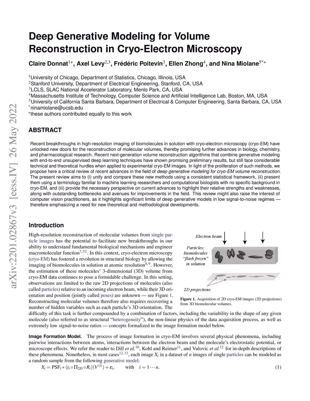 Recent breakthroughs in high resolution imaging of biomolecules in solution with cryo-electron microscopy (cryo-EM) have unlocked new doors for the reconstruction of molecular volumes, thereby promising further advances in biology, chemistry, and pharmacological research amongst others. Despite significant headway, the immense challenges in cryo-EM data analysis remain legion and intricately inter-disciplinary in nature, requiring insights from physicists, structural biologists, computer scientists, statisticians, and applied mathematicians. Meanwhile, recent next-generation volume reconstruction algorithms that combine generative modeling with end-to-end unsupervised deep learning techniques have shown promising results on simulated data, but still face considerable hurdles when applied to experimental cryo-EM images. In light of the proliferation of such methods and given the interdisciplinary nature of the task, we propose here a critical review of recent advances in the field of deep generative modeling for high resolution cryo-EM volume reconstruction. The present review aims to (i) compare and contrast these new methods, while (ii) presenting them from a perspective and using terminology familiar to scientists in each of the five aforementioned fields with no specific background in cryo-EM. The review begins with an introduction to the mathematical and computational challenges of deep generative models for cryo-EM volume reconstruction, along with an overview of the baseline methodology shared across this class of algorithms. Having established the common thread weaving through these different models, we provide a practical comparison of these state-of-the-art algorithms, highlighting their relative strengths and weaknesses, along with the assumptions that they rely on. This allows us to identify bottlenecks in current methods and avenues for future research.