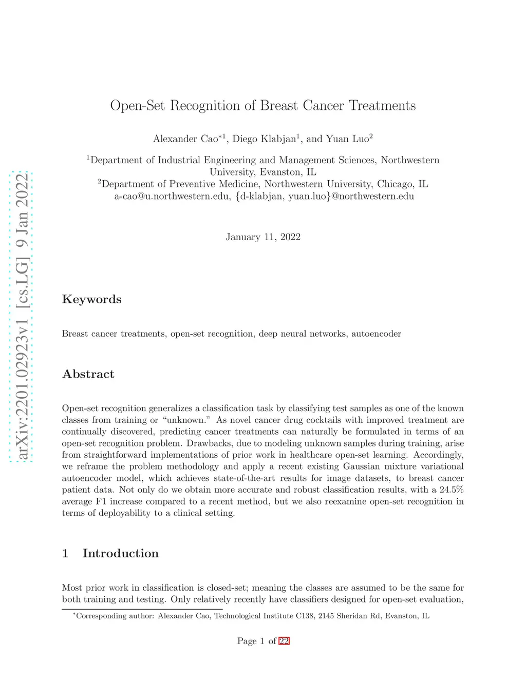 Open-set recognition generalizes a classification task by classifying test samples as one of the known classes from training or "unknown." As novel cancer drug cocktails with improved treatment are continually discovered, predicting cancer treatments can naturally be formulated in terms of an open-set recognition problem. Drawbacks, due to modeling unknown samples during training, arise from straightforward implementations of prior work in healthcare open-set learning. Accordingly, we reframe the problem methodology and apply a recent existing Gaussian mixture variational autoencoder model, which achieves state-of-the-art results for image datasets, to breast cancer patient data. Not only do we obtain more accurate and robust classification results, with a 24.5% average F1 increase compared to a recent method, but we also reexamine open-set recognition in terms of deployability to a clinical setting.