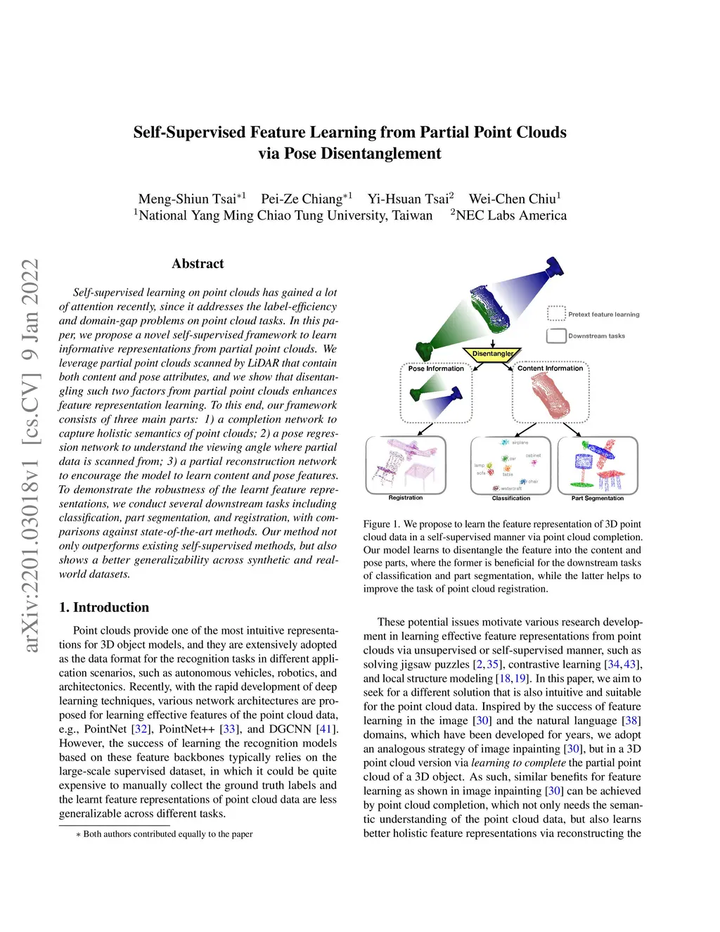 Self-supervised learning on point clouds has gained a lot of attention recently, since it addresses the label-efficiency and domain-gap problems on point cloud tasks. In this paper, we propose a novel self-supervised framework to learn informative representations from partial point clouds. We leverage partial point clouds scanned by LiDAR that contain both content and pose attributes, and we show that disentangling such two factors from partial point clouds enhances feature representation learning. To this end, our framework consists of three main parts: 1) a completion network to capture holistic semantics of point clouds; 2) a pose regression network to understand the viewing angle where partial data is scanned from; 3) a partial reconstruction network to encourage the model to learn content and pose features. To demonstrate the robustness of the learnt feature representations, we conduct several downstream tasks including classification, part segmentation, and registration, with comparisons against state-of-the-art methods. Our method not only outperforms existing self-supervised methods, but also shows a better generalizability across synthetic and real-world datasets.