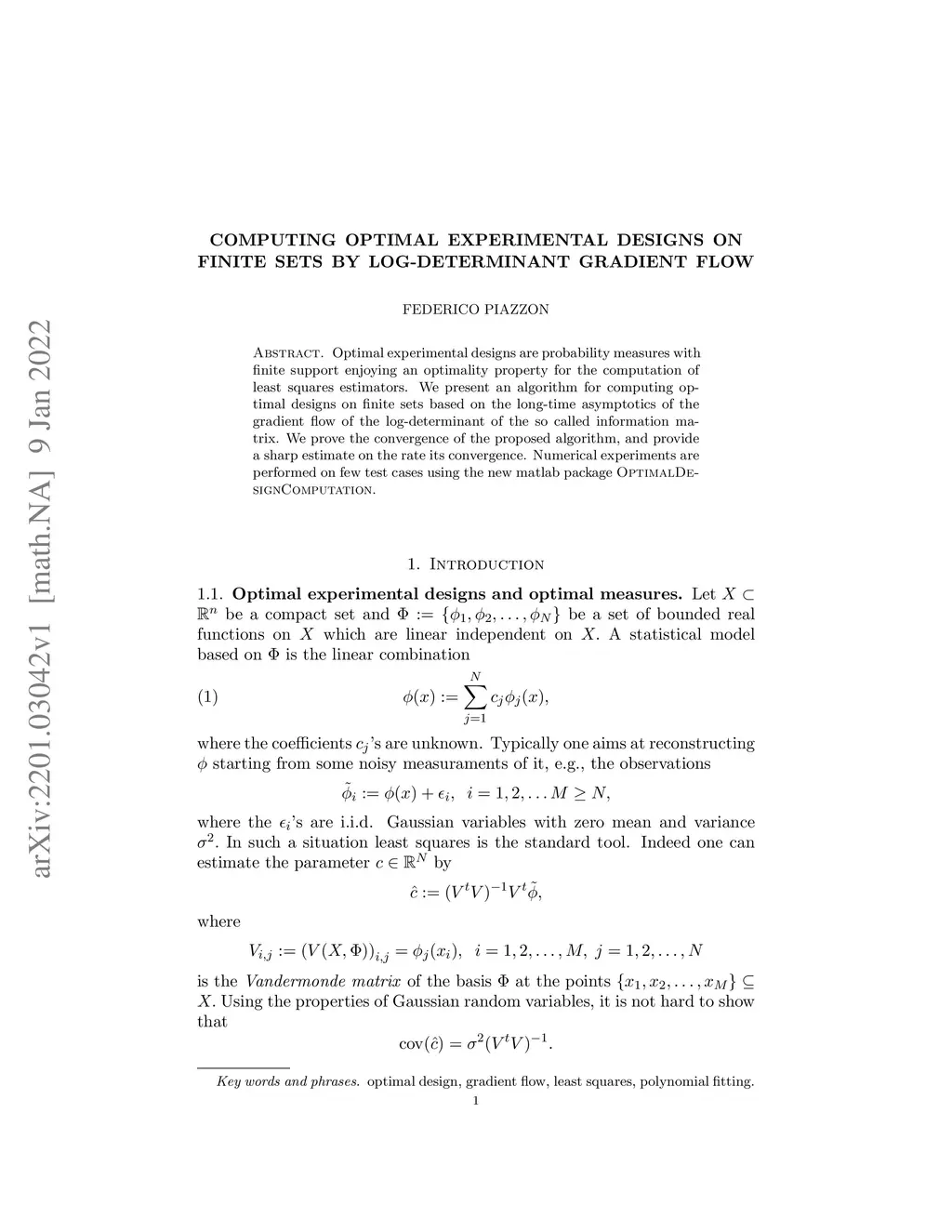 Optimal experimental designs are probability measures with finite support enjoying an optimality property for the computation of least squares estimators. We present an algorithm for computing optimal designs on finite sets based on the long-time asymptotics of the gradient flow of the log-determinant of the so called information matrix. We prove the convergence of the proposed algorithm, and provide a sharp estimate on the rate its convergence. Numerical experiments are performed on few test cases using the new matlab package OptimalDesignComputation.