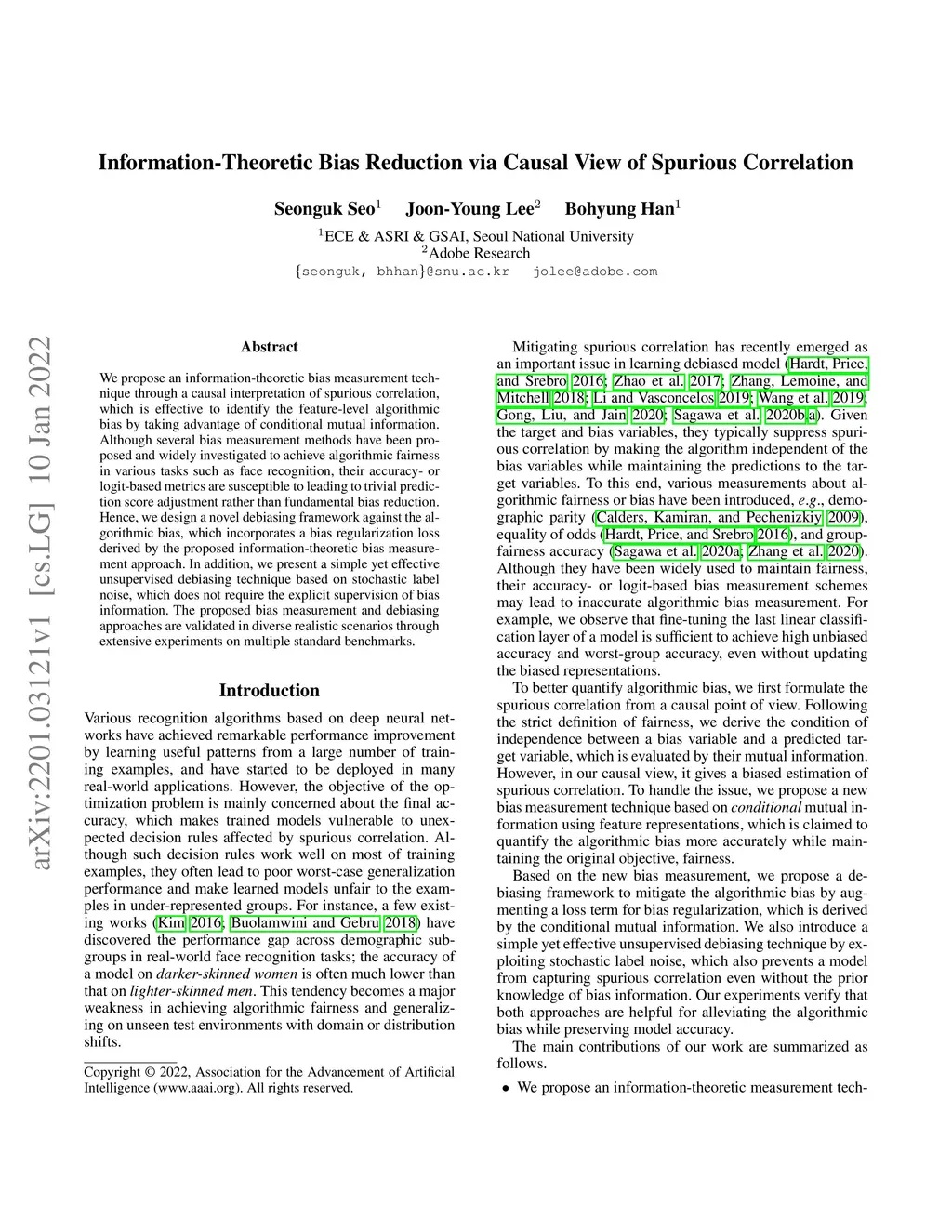 We propose an information-theoretic bias measurement technique through a causal interpretation of spurious correlation, which is effective to identify the feature-level algorithmic bias by taking advantage of conditional mutual information. Although several bias measurement methods have been proposed and widely investigated to achieve algorithmic fairness in various tasks such as face recognition, their accuracy- or logit-based metrics are susceptible to leading to trivial prediction score adjustment rather than fundamental bias reduction. Hence, we design a novel debiasing framework against the algorithmic bias, which incorporates a bias regularization loss derived by the proposed information-theoretic bias measurement approach. In addition, we present a simple yet effective unsupervised debiasing technique based on stochastic label noise, which does not require the explicit supervision of bias information. The proposed bias measurement and debiasing approaches are validated in diverse realistic scenarios through extensive experiments on multiple standard benchmarks.