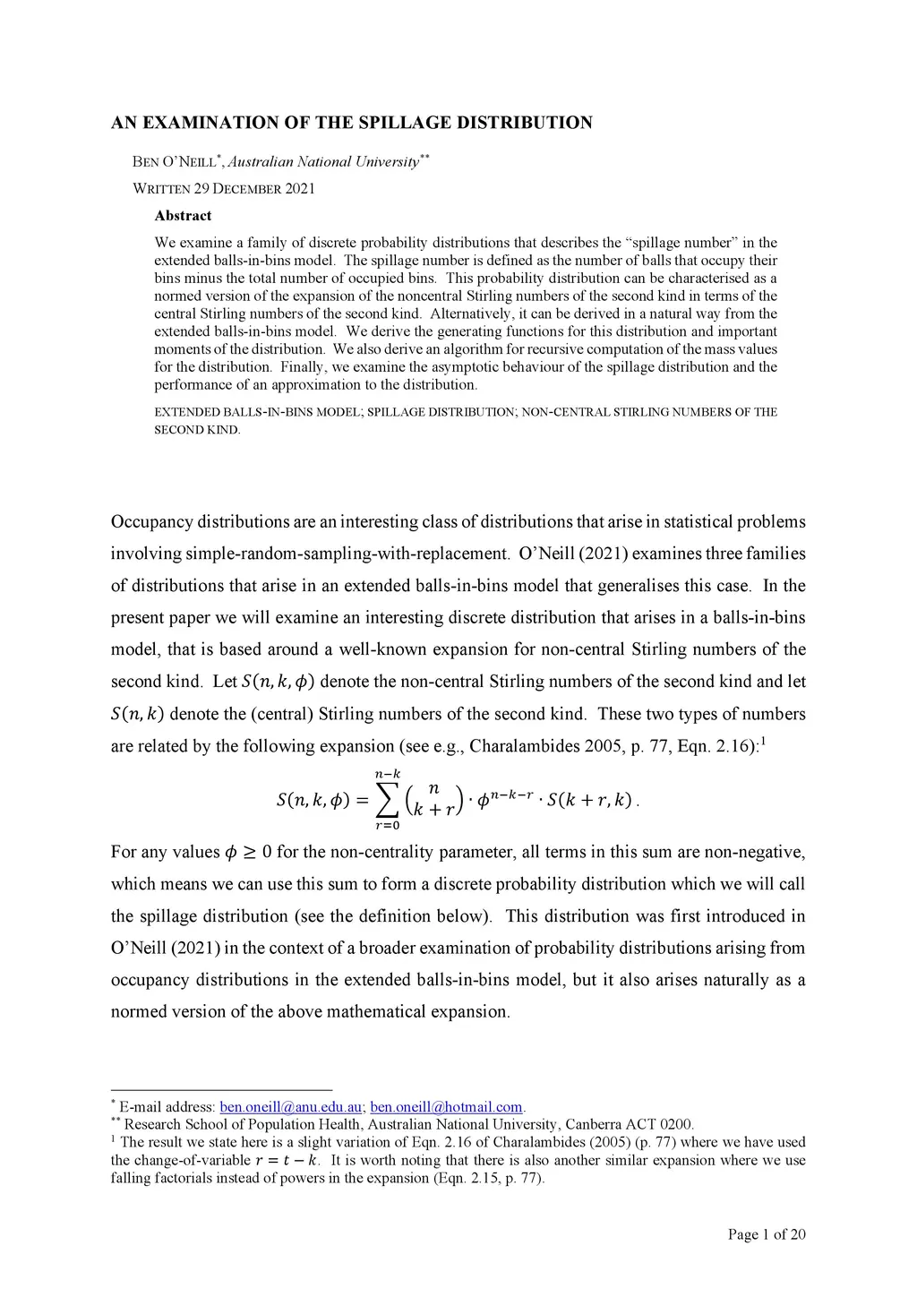 We examine a family of discrete probability distributions that describes the "spillage number" in the extended balls-in-bins model. The spillage number is defined as the number of balls that occupy their bins minus the total number of occupied bins. This probability distribution can be characterised as a normed version of the expansion of the noncentral Stirling numbers of the second kind in terms of the central Stirling numbers of the second kind. Alternatively it can be derived in a natural way from the extended balls-in-bins model. We derive the generating functions for this distribution and important moments of the distribution. We also derive an algorithm for recursive computation of the mass values for the distribution. Finally, we examine the asymptotic behaviour of the spillage distribution and the performance of an approximation to the distribution.