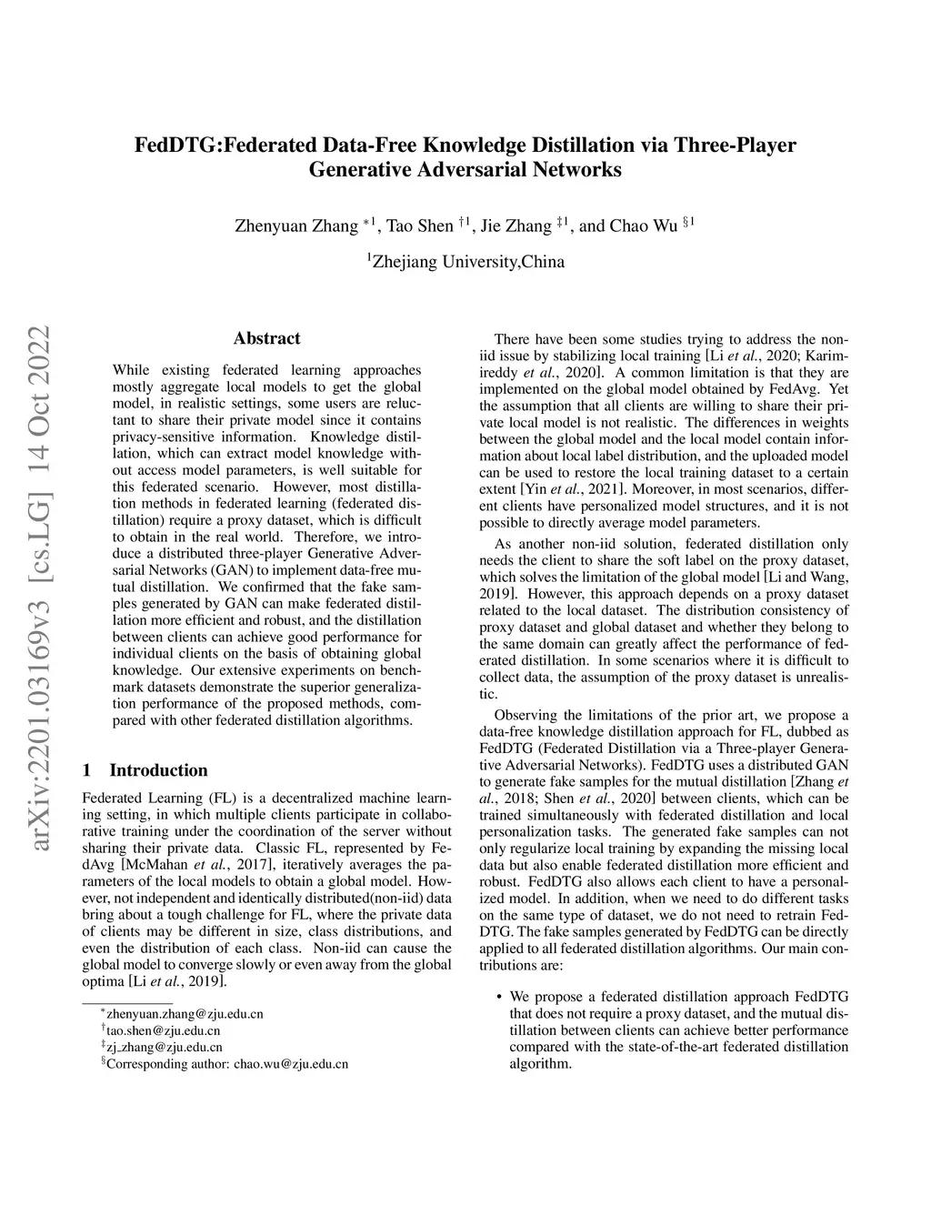 FedDTG:Federated Data-Free Knowledge Distillation via Three-Player Generative Adversarial Networks