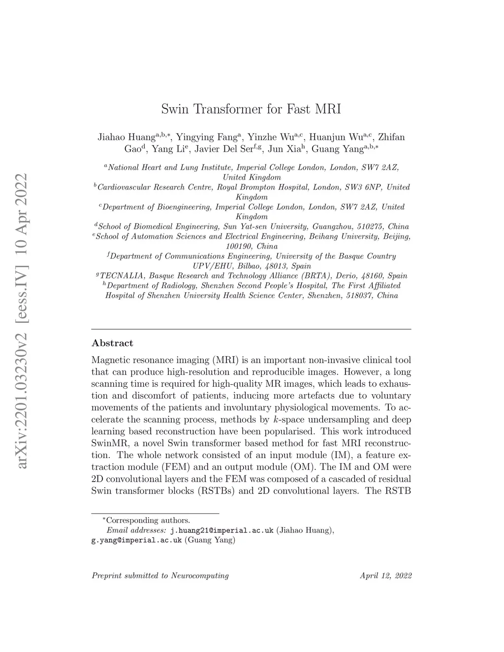 Magnetic resonance imaging (MRI) is an important non-invasive clinical tool that can produce high-resolution and reproducible images. However, a long scanning time is required for high-quality MR images, which leads to exhaustion and discomfort of patients, inducing more artefacts due to voluntary movements of the patients and involuntary physiological movements. To accelerate the scanning process, methods by k-space undersampling and deep learning based reconstruction have been popularised. This work introduced SwinMR, a novel Swin transformer based method for fast MRI reconstruction. The whole network consisted of an input module (IM), a feature extraction module (FEM) and an output module (OM). The IM and OM were 2D convolutional layers and the FEM was composed of a cascaded of residual Swin transformer blocks (RSTBs) and 2D convolutional layers. The RSTB consisted of a series of Swin transformer layers (STLs). The shifted windows multi-head self-attention (W-MSA/SW-MSA) of STL was performed in shifted windows rather than the multi-head self-attention (MSA) of the original transformer in the whole image space. A novel multi-channel loss was proposed by using the sensitivity maps, which was proved to reserve more textures and details. We performed a series of comparative studies and ablation studies in the Calgary-Campinas public brain MR dataset and conducted a downstream segmentation experiment in the Multi-modal Brain Tumour Segmentation Challenge 2017 dataset. The results demonstrate our SwinMR achieved high-quality reconstruction compared with other benchmark methods, and it shows great robustness with different undersampling masks, under noise interruption and on different datasets. The code is publicly available at https://github.com/ayanglab/SwinMR.