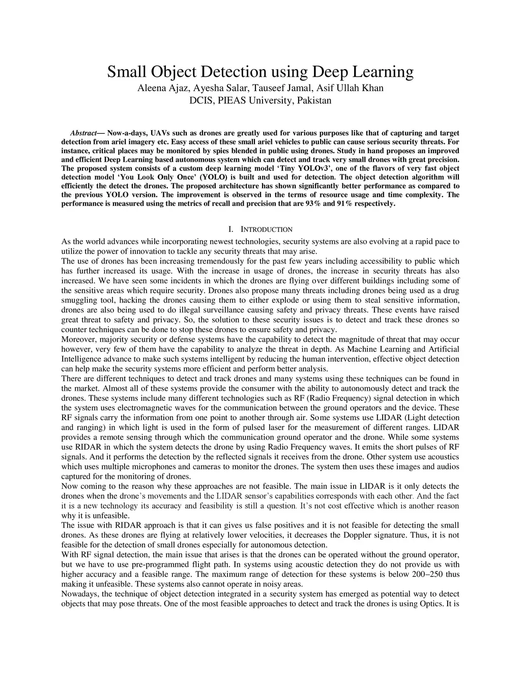 Now a days, UAVs such as drones are greatly used for various purposes like that of capturing and target detection from ariel imagery etc. Easy access of these small ariel vehicles to public can cause serious security threats. For instance, critical places may be monitored by spies blended in public using drones. Study in hand proposes an improved and efficient Deep Learning based autonomous system which can detect and track very small drones with great precision. The proposed system consists of a custom deep learning model Tiny YOLOv3, one of the flavors of very fast object detection model You Look Only Once (YOLO) is built and used for detection. The object detection algorithm will efficiently the detect the drones. The proposed architecture has shown significantly better performance as compared to the previous YOLO version. The improvement is observed in the terms of resource usage and time complexity. The performance is measured using the metrics of recall and precision that are 93% and 91% respectively.