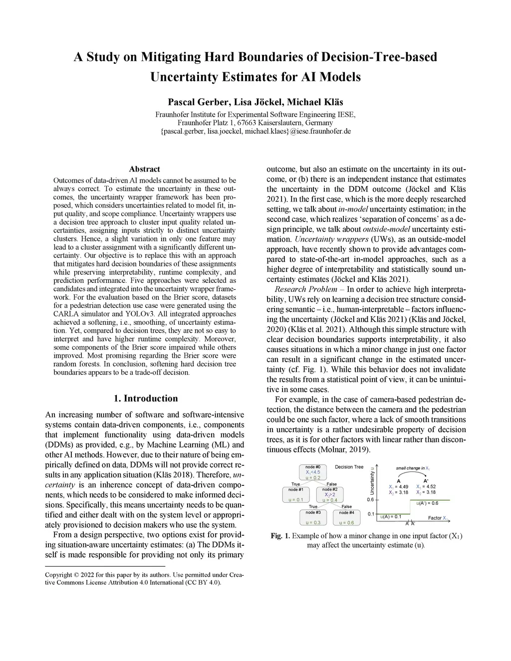 Outcomes of data-driven AI models cannot be assumed to be always correct. To estimate the uncertainty in these outcomes, the uncertainty wrapper framework has been proposed, which considers uncertainties related to model fit, input quality, and scope compliance. Uncertainty wrappers use a decision tree approach to cluster input quality related uncertainties, assigning inputs strictly to distinct uncertainty clusters. Hence, a slight variation in only one feature may lead to a cluster assignment with a significantly different uncertainty. Our objective is to replace this with an approach that mitigates hard decision boundaries of these assignments while preserving interpretability, runtime complexity, and prediction performance. Five approaches were selected as candidates and integrated into the uncertainty wrapper framework. For the evaluation based on the Brier score, datasets for a pedestrian detection use case were generated using the CARLA simulator and YOLOv3. All integrated approaches achieved a softening, i.e., smoothing, of uncertainty estimation. Yet, compared to decision trees, they are not so easy to interpret and have higher runtime complexity. Moreover, some components of the Brier score impaired while others improved. Most promising regarding the Brier score were random forests. In conclusion, softening hard decision tree boundaries appears to be a trade-off decision.