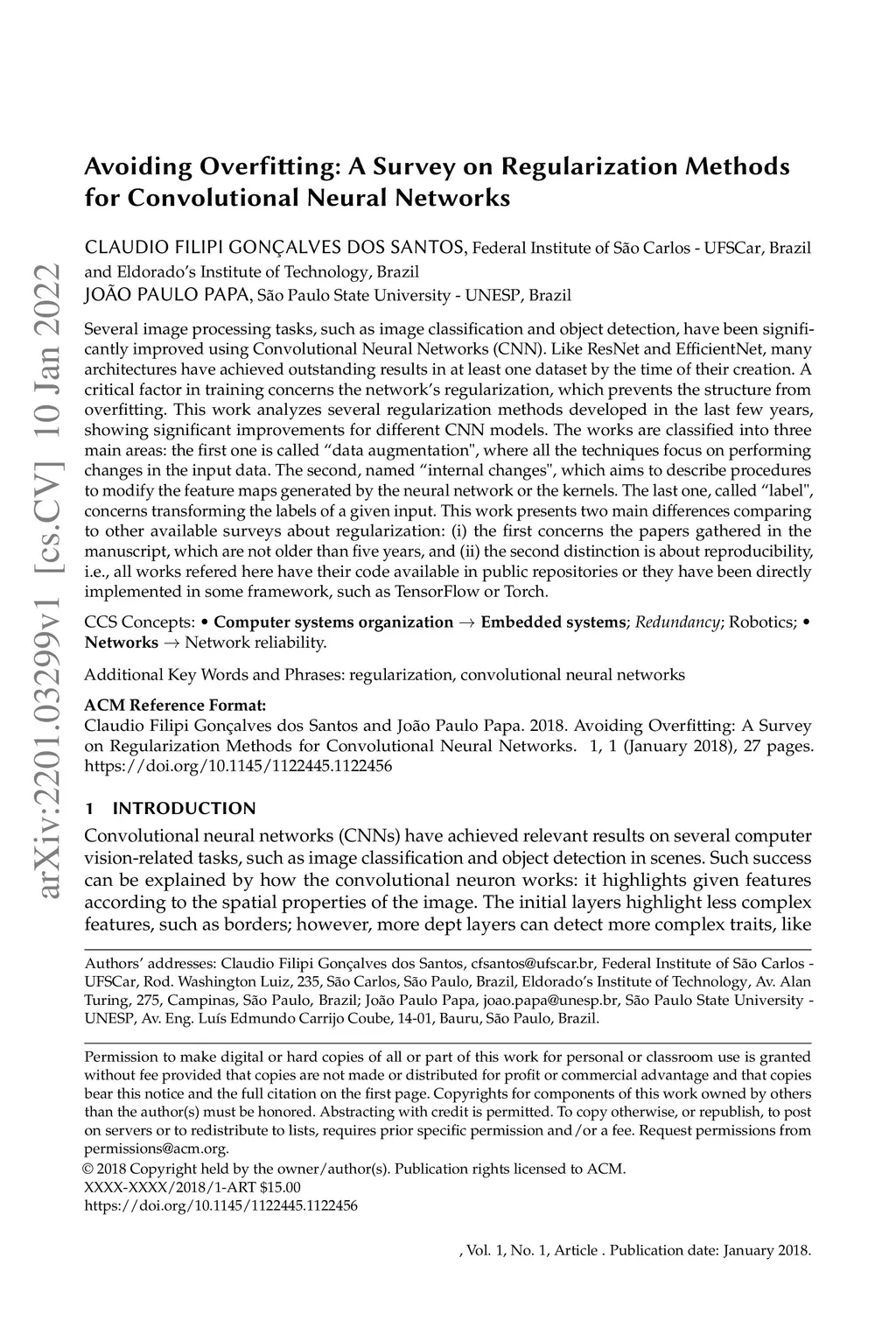 Several image processing tasks, such as image classification and object detection, have been significantly improved using Convolutional Neural Networks (CNN). Like ResNet and EfficientNet, many architectures have achieved outstanding results in at least one dataset by the time of their creation. A critical factor in training concerns the network's regularization, which prevents the structure from overfitting. This work analyzes several regularization methods developed in the last few years, showing significant improvements for different CNN models. The works are classified into three main areas: the first one is called "data augmentation", where all the techniques focus on performing changes in the input data. The second, named "internal changes", which aims to describe procedures to modify the feature maps generated by the neural network or the kernels. The last one, called "label", concerns transforming the labels of a given input. This work presents two main differences comparing to other available surveys about regularization: (i) the first concerns the papers gathered in the manuscript, which are not older than five years, and (ii) the second distinction is about reproducibility, i.e., all works refered here have their code available in public repositories or they have been directly implemented in some framework, such as TensorFlow or Torch.