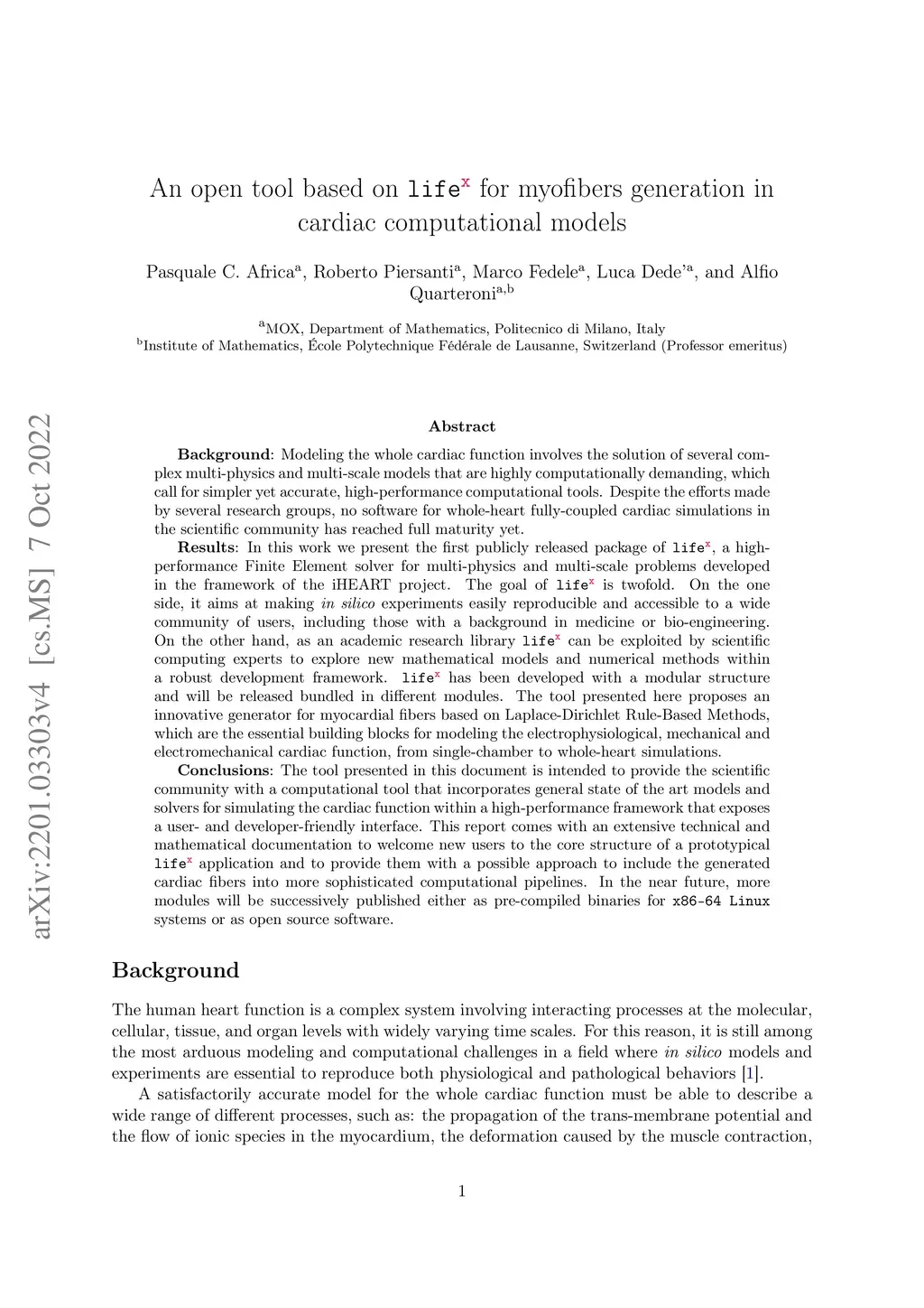 Modeling the whole cardiac function involves the solution of several complex multi-physics and multi-scale models that are highly computationally demanding, which call for simpler yet accurate, high-performance computational tools. Despite the efforts made by several research groups, no software for whole-heart fully-coupled cardiac simulations in the scientific community has reached full maturity yet. In this work we present the first publicly released package of lifex, a high-performance Finite Element solver for multi-physics and multi-scale problems developed in the framework of the iHEART project. The goal of lifex is twofold. On the one side, it aims at making in silico experiments easily reproducible and accessible to a wide community of users, including those with a background in medicine or bio-engineering. On the other hand, as an academic research library lifex can be exploited by scientific computing experts to explore new mathematical models and numerical methods within a robust development framework. lifex has been developed with a modular structure and will be released bundled in different modules. The tool presented here proposes an innovative generator for myocardial fibers based on Laplace-Dirichlet Rule-Based Methods, which are the essential building blocks for modeling the electrophysiological, mechanical and electromechanical cardiac function, from single-chamber to whole-heart simulations. This report comes with an extensive technical and mathematical documentation to welcome new users to the core structure of a prototypical lifex application and to provide them with a possible approach to include the generated cardiac fibers into more sophisticated computational pipelines.