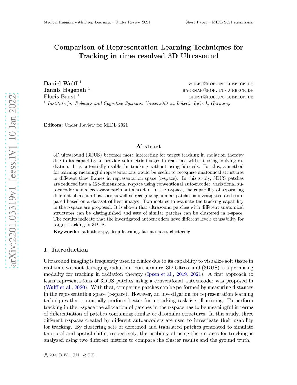 3D ultrasound (3DUS) becomes more interesting for target tracking in radiation therapy due to its capability to provide volumetric images in real-time without using ionizing radiation. It is potentially usable for tracking without using fiducials. For this, a method for learning meaningful representations would be useful to recognize anatomical structures in different time frames in representation space (r-space). In this study, 3DUS patches are reduced into a 128-dimensional r-space using conventional autoencoder, variational autoencoder and sliced-wasserstein autoencoder. In the r-space, the capability of separating different ultrasound patches as well as recognizing similar patches is investigated and compared based on a dataset of liver images. Two metrics to evaluate the tracking capability in the r-space are proposed. It is shown that ultrasound patches with different anatomical structures can be distinguished and sets of similar patches can be clustered in r-space. The results indicate that the investigated autoencoders have different levels of usability for target tracking in 3DUS.