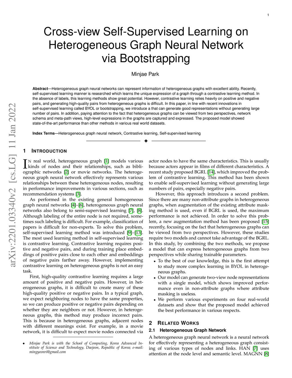 Heterogeneous graph neural networks can represent information of heterogeneous graphs with excellent ability. Recently, self-supervised learning manner is researched which learns the unique expression of a graph through a contrastive learning method. In the absence of labels, this learning methods show great potential. However, contrastive learning relies heavily on positive and negative pairs, and generating high-quality pairs from heterogeneous graphs is difficult. In this paper, in line with recent innovations in self-supervised learning called BYOL or bootstrapping, we introduce a that can generate good representations without generating large number of pairs. In addition, paying attention to the fact that heterogeneous graphs can be viewed from two perspectives, network schema and meta-path views, high-level expressions in the graphs are captured and expressed. The proposed model showed state-of-the-art performance than other methods in various real world datasets.