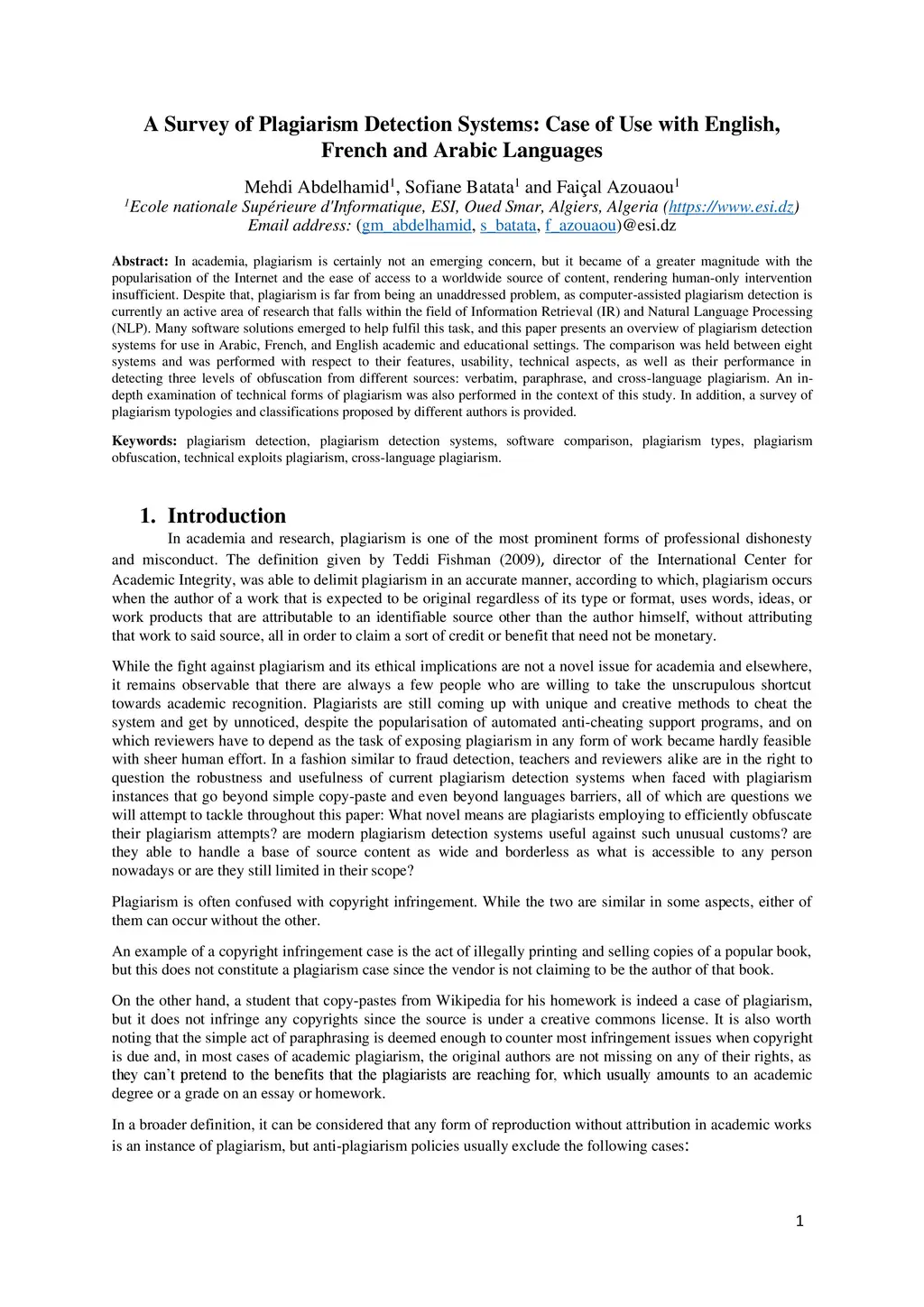 A Survey of Plagiarism Detection Systems: Case of Use with English,