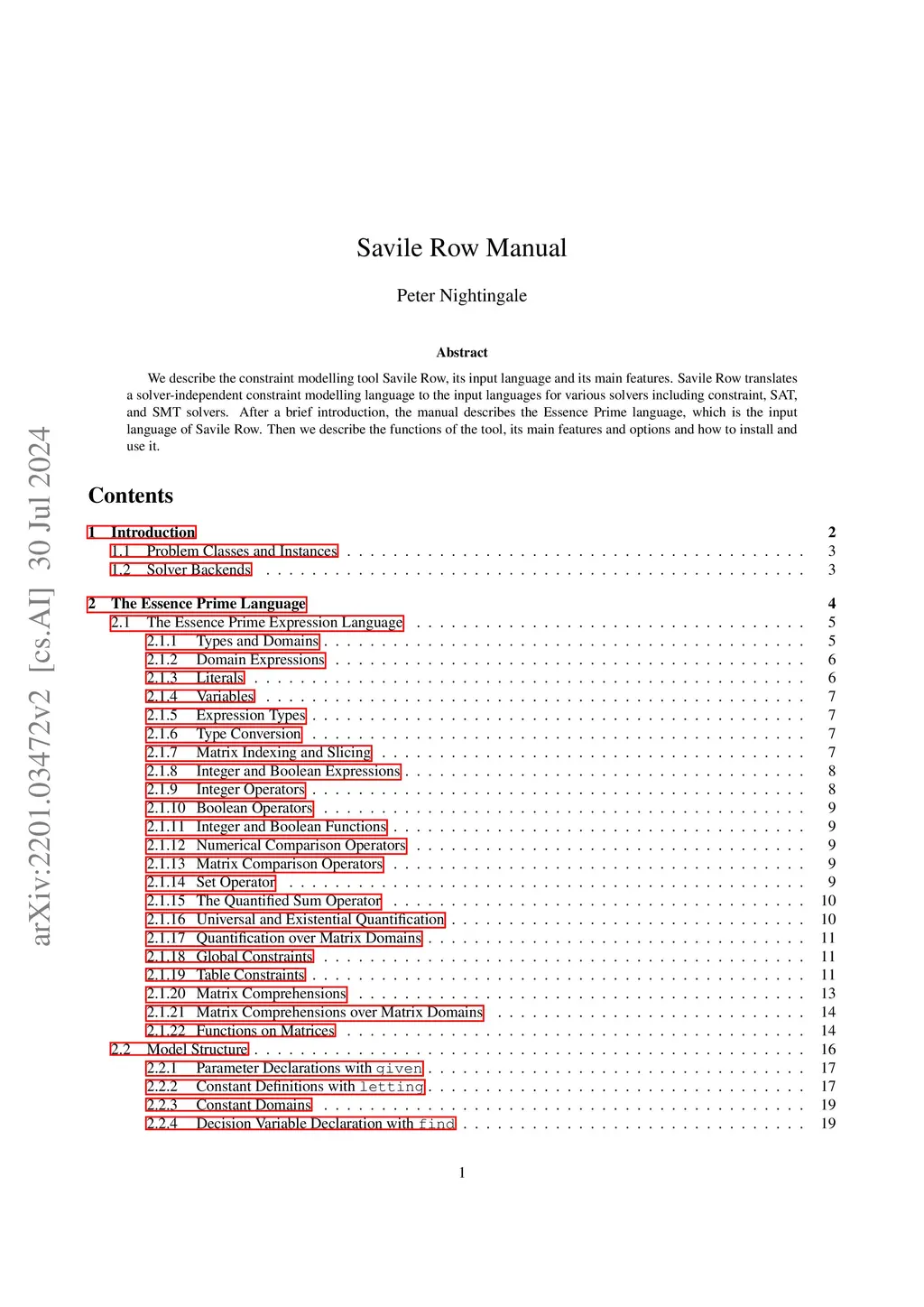 We describe the constraint modelling tool Savile Row, its input language and its main features. Savile Row translates a solver-independent constraint modelling language to the input languages for various solvers including constraint, SAT, and SMT solvers. After a brief introduction, the manual describes the Essence Prime language, which is the input language of Savile Row. Then we describe the functions of the tool, its main features and options and how to install and use it.