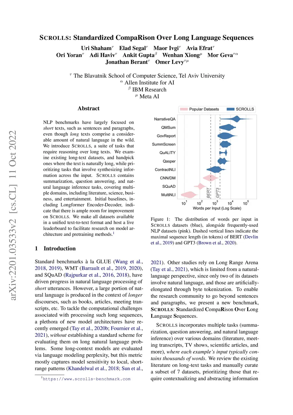 SCROLLS: Standardized CompaRison Over Long Language Sequences