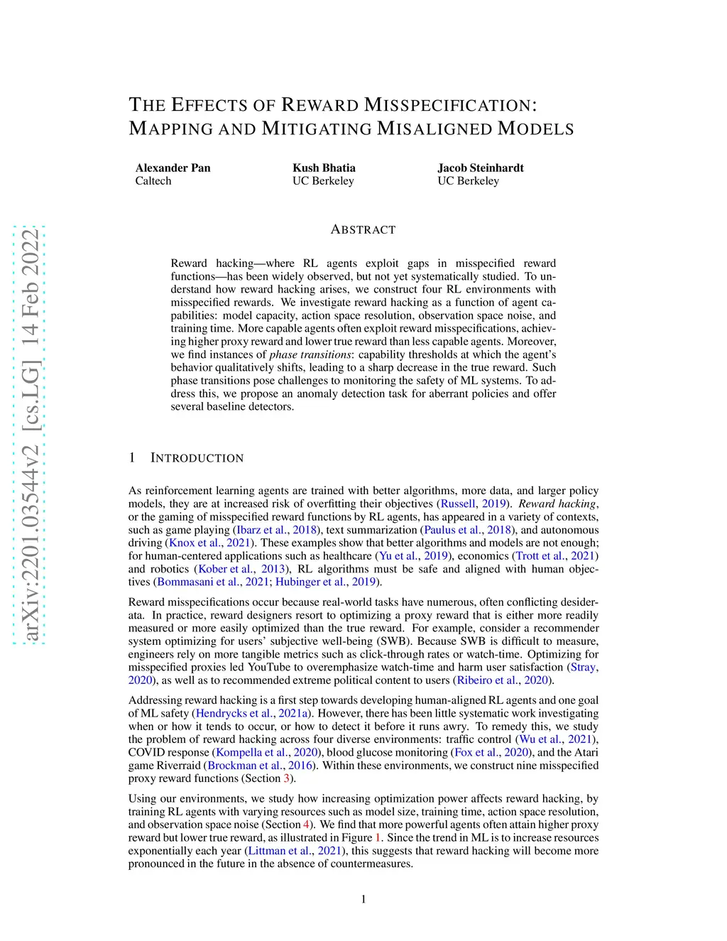 Reward hacking -- where RL agents exploit gaps in misspecified reward functions -- has been widely observed, but not yet systematically studied. To understand how reward hacking arises, we construct four RL environments with misspecified rewards. We investigate reward hacking as a function of agent capabilities: model capacity, action space resolution, observation space noise, and training time. More capable agents often exploit reward misspecifications, achieving higher proxy reward and lower true reward than less capable agents. Moreover, we find instances of phase transitions: capability thresholds at which the agent's behavior qualitatively shifts, leading to a sharp decrease in the true reward. Such phase transitions pose challenges to monitoring the safety of ML systems. To address this, we propose an anomaly detection task for aberrant policies and offer several baseline detectors.