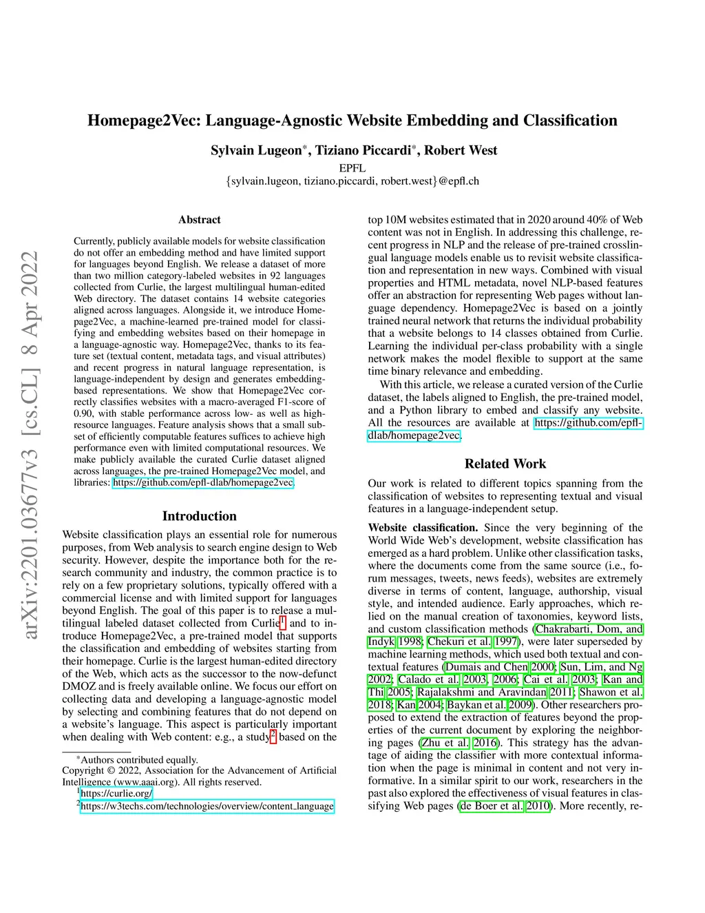 Homepage2Vec: Language-Agnostic Website Embedding and Classification
